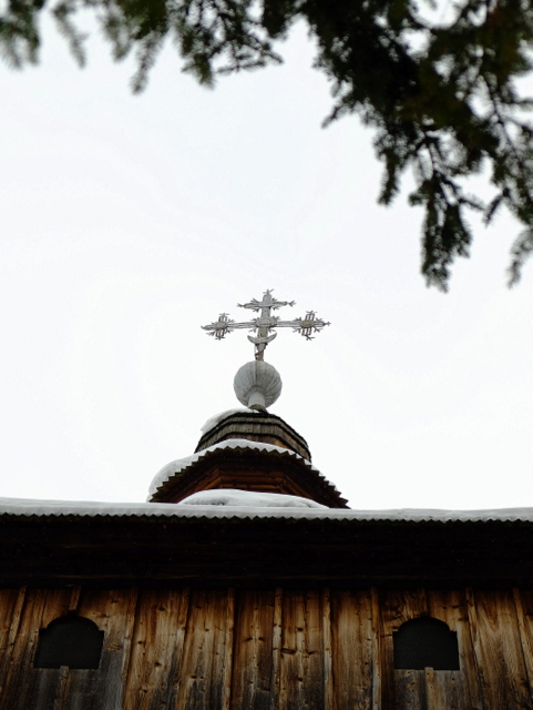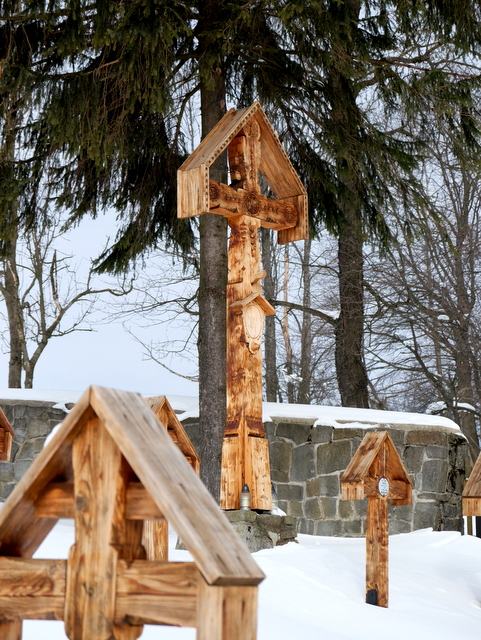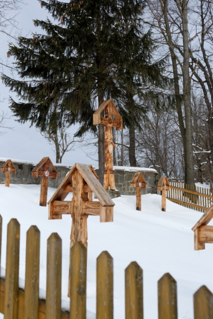 Do cerkwi podchodzę jodełką dość stromo wznoszącą się drogą. Zatrzymuję się przy niej i przy obu cmentarzach aby zrobić kilka zdjęć.