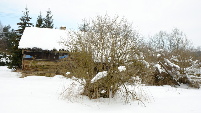 Pod tablicą strzałka kierunkowa do wartego polecenia gospodarstwa agroturystycznego Chatka na Wołowcu odległego o ok. 100 m od tego miejsca. Zachowało się tu wiele starych, drewnianych domów, zarośniętych krzakami. Obecnie zimą lepiej je widać bo nie ma na krzaczyskach liści.