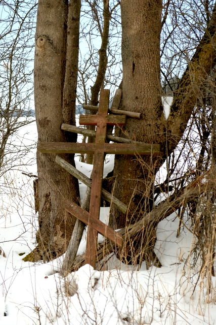 Po krótkim pobycie na otwartych terenach zaczynam zjeżdżać w dół, do drogi Wołowiec – Nieznajowa. Przejeżdżam obok starych ale odnowionych i ogrodzonych, przydrożnych krzyży.