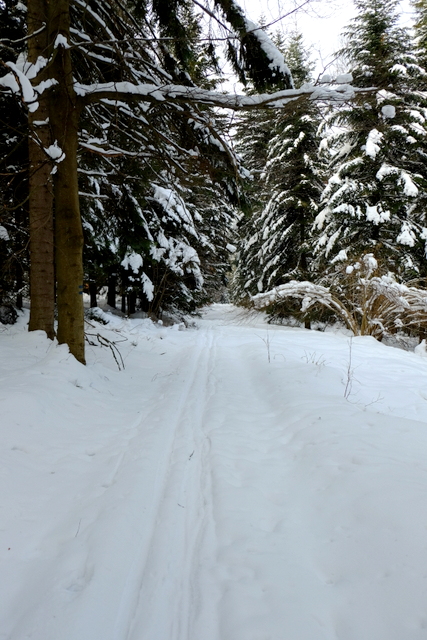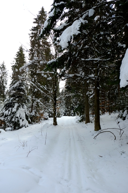Trasa początkowo łagodnie wznosi się w górę, w kierunku północnym aż do okolic wspomnianego wcześniej przystanku autobusowego, po czym łagodnym łukiem zwraca się na południe. Widać, że niedawno założony był ślad do stylu klasycznego i ja też taki preferuję. „Łyżwą” nawet nie próbuję biec mimo, że wzdłuż śladu do klasyka wyratrakowana jest trasa do stylu łyżwowego. Sportowcem nie jestem i nie mam już sportowych ambicji więc klasyk jest dla mnie wygodniejszy, bo nie wymaga tyle wysiłku. Mam przed sobą spory kawałek szlaku do pokonania muszę więc się trochę oszczędzać. Często tutaj, gdy w weekendy organizowane są różne zawody sportowe dla młodzieży, trasy są ratrakowane do stylu łyżwowego (dowolnego). Niech więc pozostaną nienaruszone, przynajmniej przeze mnie.