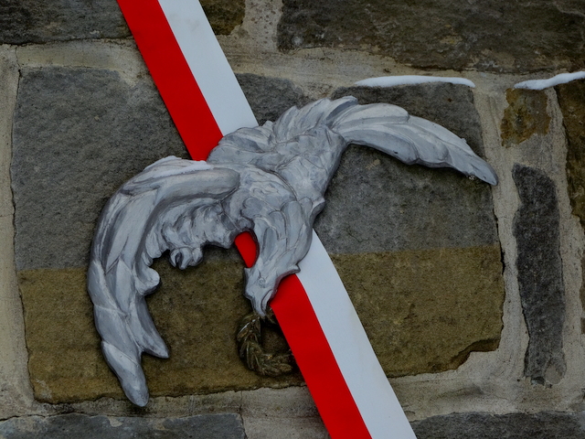 Ładne stąd widoki na góry otaczające Krzywą i sąsiednią Banicę. Niewielki dystans pozostał mi do końca dzisiejszej wędrówki. Wkrótce dochodzę do nowej drogi leśnej i zjeżdżam nią do drogi asfaltowej. Niedaleko od miejsca, gdzie ta droga leśna się kończy, znajduje się okazały pomnik upamiętniający katastrofę brytyjskiego samolotu Halifax z polską załogą, jaka miała tu miejsce w sierpniu 1944 roku.