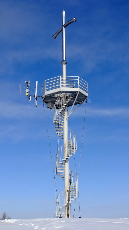 Na platformę widokową wchodzimy po stalowych, krętych schodkach. Widoki stąd są rozległe i rozciągają się we wszystkich kierunkach. Pogoda poprawiła się znacznie, mamy już duże przejaśnienia i pojawiające się na coraz większej przestrzeni błękitne niebo. Wiatr praktycznie nie wieje, słońce też coraz śmielej wyłania się zza chmur więc odczuwalna temperatura nie daje się we znaki.