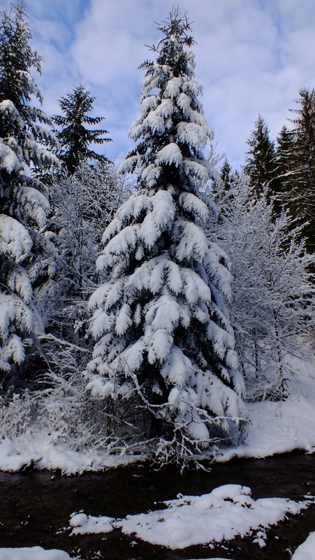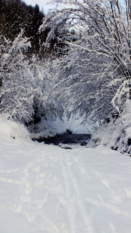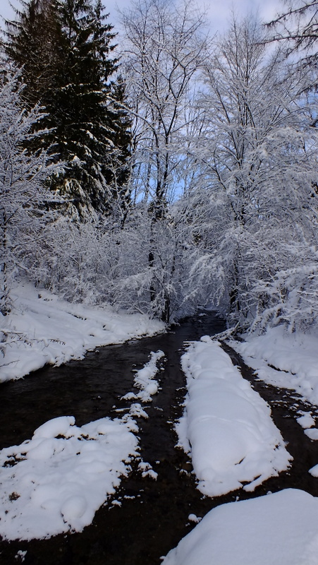 Pokonujemy bród na potoku przedostając się na jego drugą stronę. Myscówka przepływa tutaj wąskim jarem między południowymi stokami Horbu (505 m n.p.m.) i północnymi Szczobu (544 m n.p.m.). Piękne tutaj i dziko, ponadto zwisające gałęzie drzew i krzewów obciążone śniegiem, przydają tajemniczości temu zakątkowi, tworząc wrażenie jakby innego świata. Lubię takie miejsca.