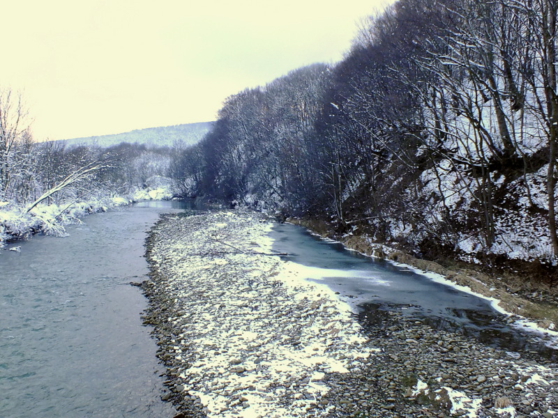 Droga jest tu odśnieżona więc musimy poruszać się po śniegu obok niej. Pokonujemy tak odległość około kilometra po czym wbiegamy na zaśnieżone łąki zbliżając się do rzeki. Tutaj przechodzimy wiszącą na linach ławą (dla tych, którzy nie znają tej nazwy – to taka dawna nazwa kładki wiszącej na stalowych linach) na drugi brzeg Wisłoki.