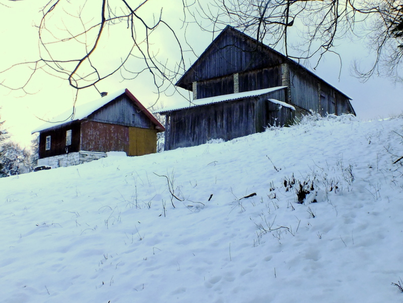 Zaraz po przekroczeniu rzeki Wisłoki zaczyna się strome podejście. Przechodzimy obok starego domu, budynku gospodarczego i zaniedbanego sadu. Zachmurzyło się już bardzo i wiatr też się wzmaga przez co robi się coraz zimniej. Podejście na grzbiet odchodzący od Kamienia jest ciężkie i coraz bardziej odczuwam zmęczenie. Dzisiejsza, bardzo urozmaicona trasa to suma podejść i zjazdów … W połowie podejścia na grzbiet teren nieco się wypłaszcza jednak to krótki odcinek a po jego minięciu znów zaczyna się stromizna.