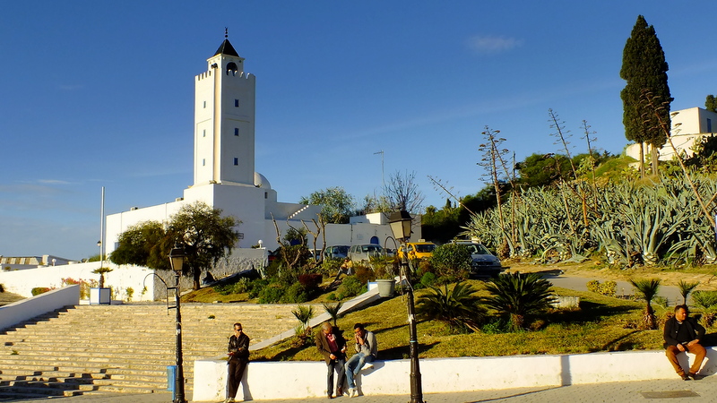 Tak więc po przyjeździe tutaj zostawiliśmy samochód na parkingu i zapuściliśmy w gąszcz biało-niebieskich budynków. Na samym początku przyciągnął naszą uwagę wysoki minaret meczetu. Zbudował go Hussein I Bey w pierwszej połowie XVIII wieku, na wzgórzu obok zawiji gdzie pochowany został św. mistyk Abou Saïd Khalaf Ibn Yahya el-Tamimi el-Béji.