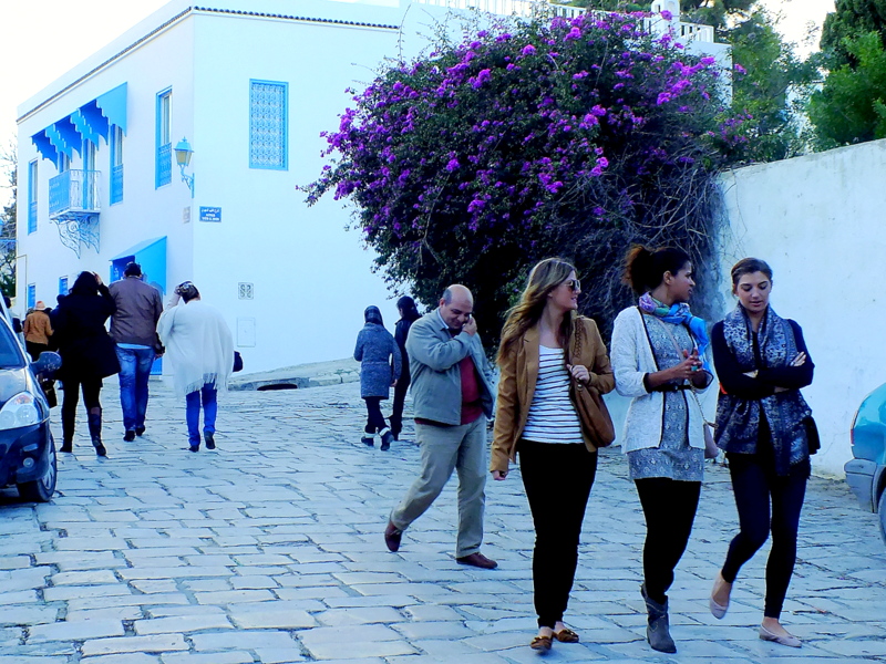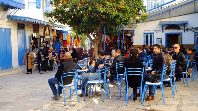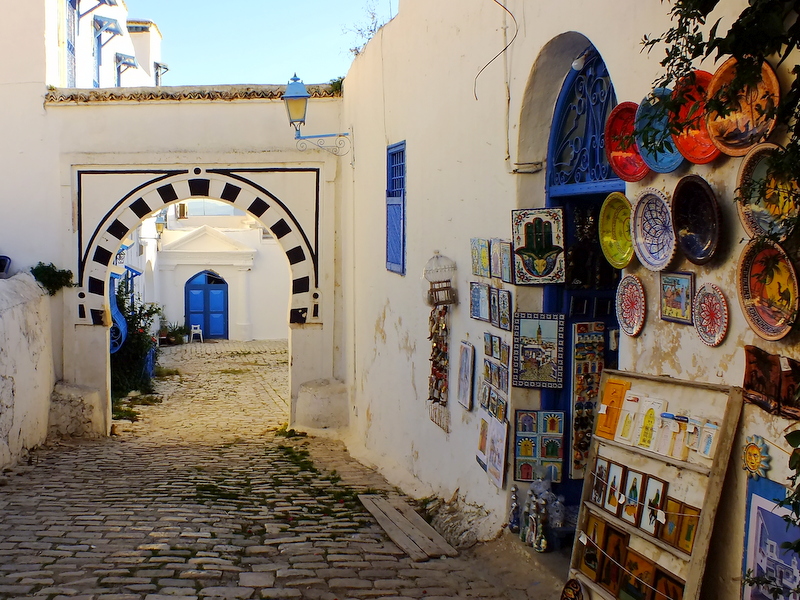 Przechadzkę po Sidi Bou Said zaczęliśmy od wypełnionej tłumem ludzi głównej ulicy bo to głównie przy niej zlokalizowane są najbardziej atrakcyjne miejsca. Jest tu sporo suk, w których można kupić wszystko co niezbędne lub zbędne. Poczynając od wyrobów miejscowych rzemieślników i artystów z ceramiki, szkła, drewna oliwnego, metalu poprzez biżuterię, perfumy, kadzidła. Także witrażowe lampki, zestawy szklaneczek do herbaty, kończąc na orientalnej klatce dla ptaków w niebiesko-białych kolorach, całej w arabeskowych rzeźbionych krzywiznach.