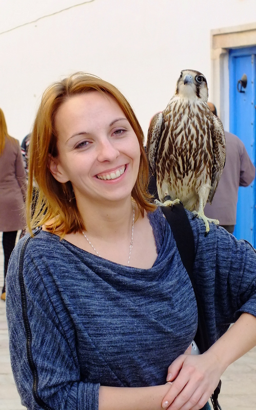 W pewnym momencie nieopodal jednej z galerii zauważyłem dwie młode dziewczyny siedzące na stopniach kamiennych schodów. Od razu mój wzrok padł na siedzącego na kolanie jednej z nich sokoła.