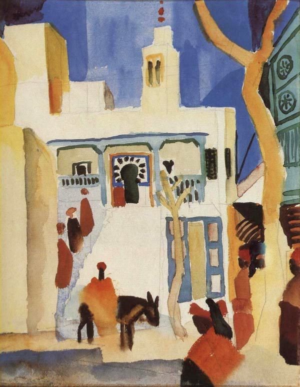 Obraz ten powstał w 1914 roku kiedy to August Macke wraz Paulem Klee podróżowali po Tunezji i odwiedzili Sidi Bou Said. Nosi on tytuł „Widok na meczet” i przedstawia minaret meczetu wystający zza budynku kawiarni Cafe des Nattes.