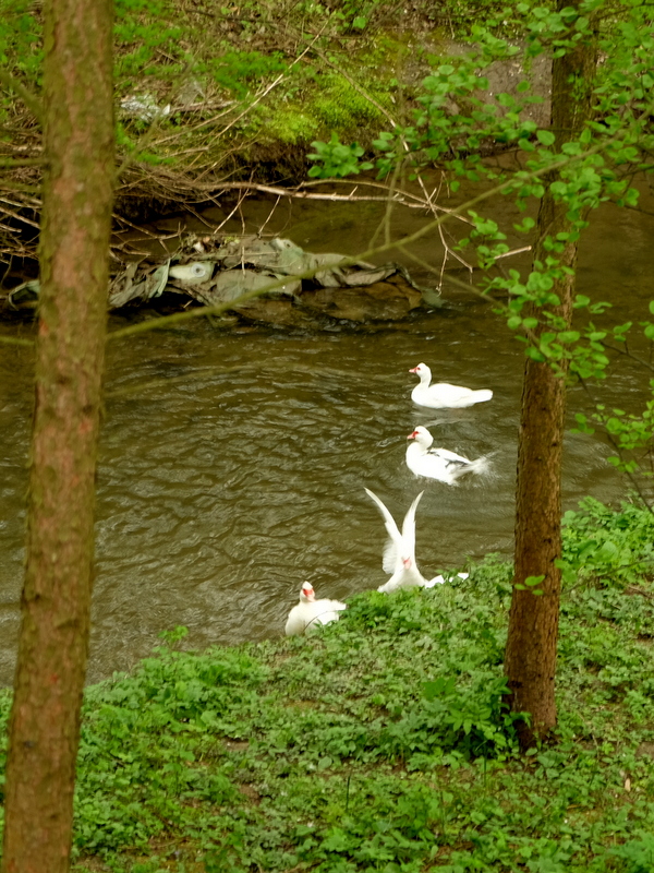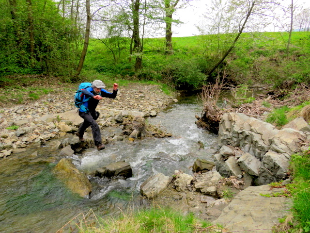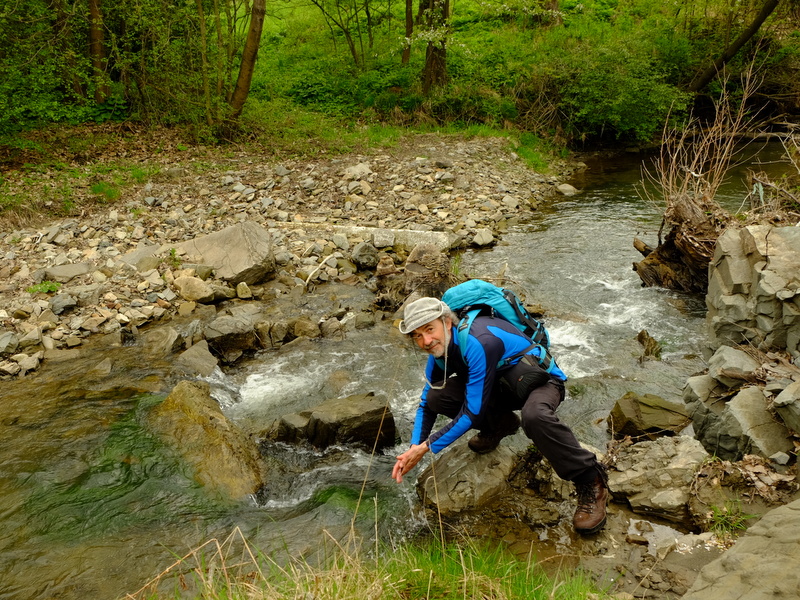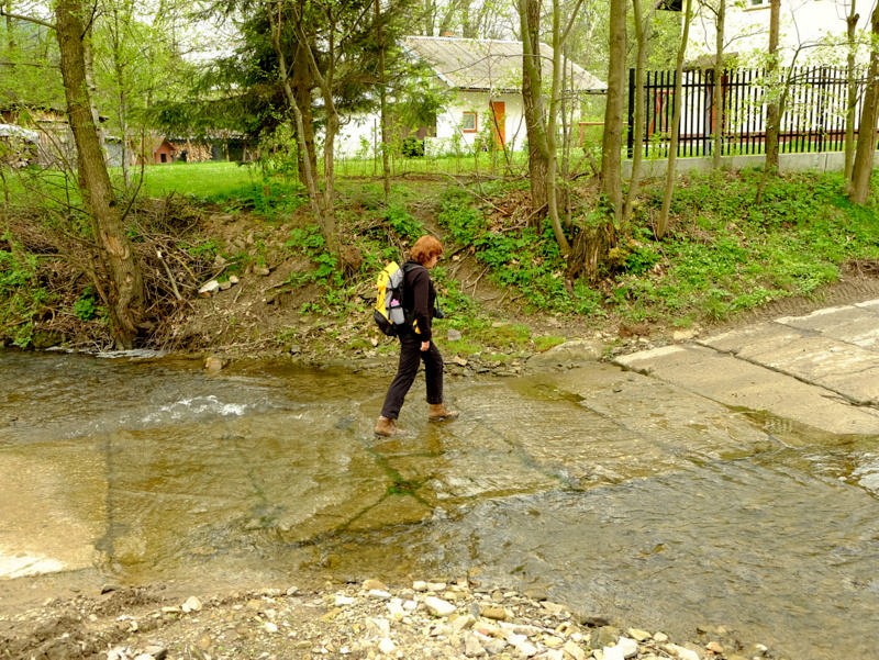 Znajdujemy takie miejsce w dość głęboko wciętym jarze, w którym woda płynie wartko a w korycie leżą duże kamienie. Przy odrobinie szczęścia można po nich przejść na drugą stronę Bednarki. Przeskakując z kamienia na kamień udało mi pokonać Bednarkę a koleżanka poszukała sobie dogodniejszego miejsca do przejścia nieco dalej.