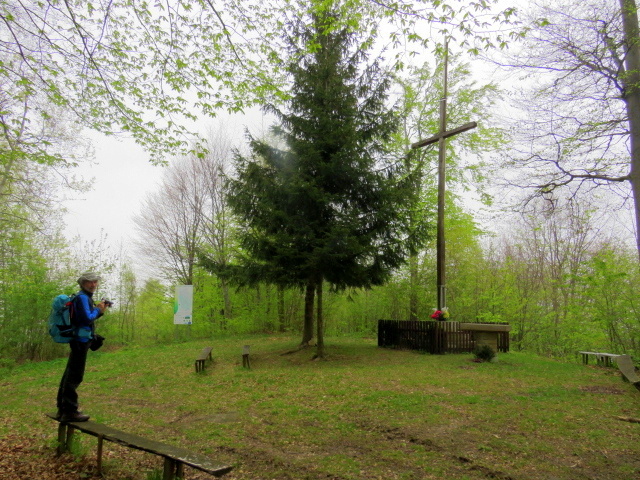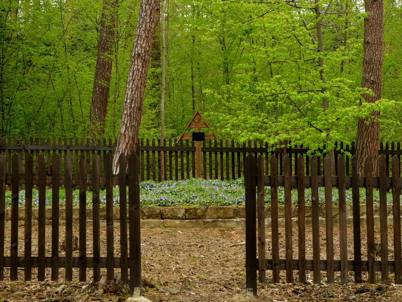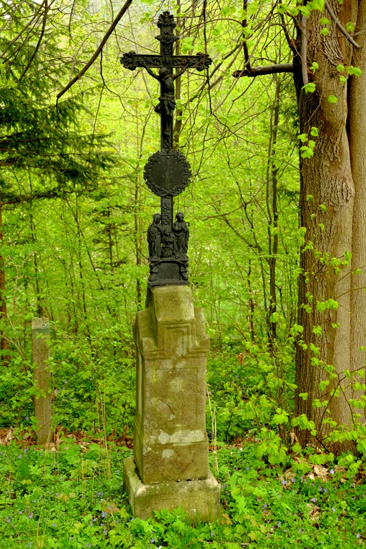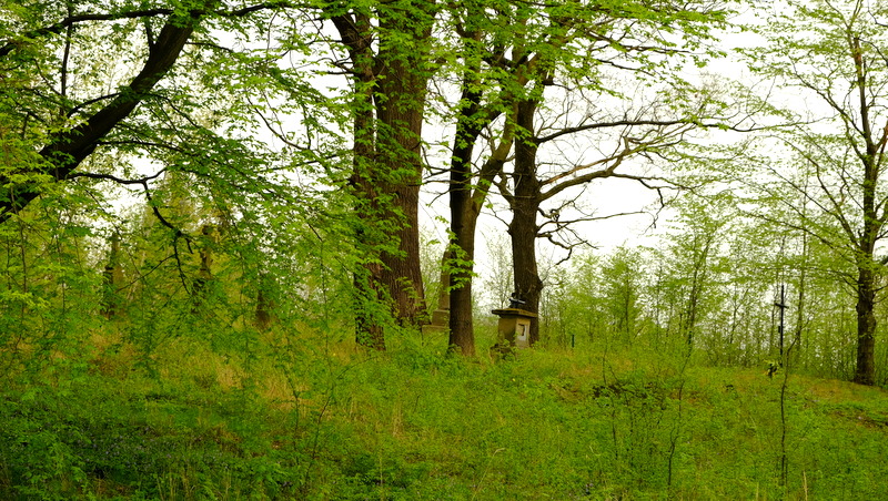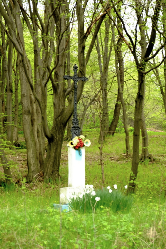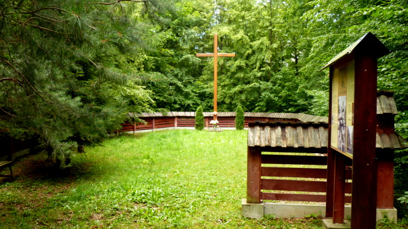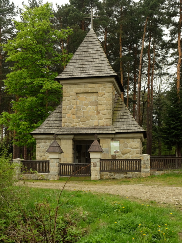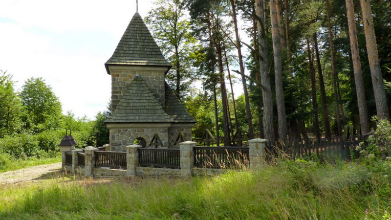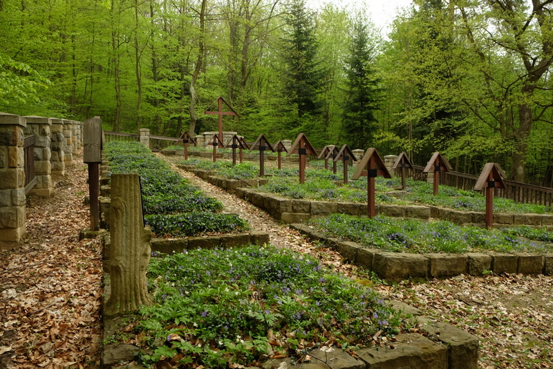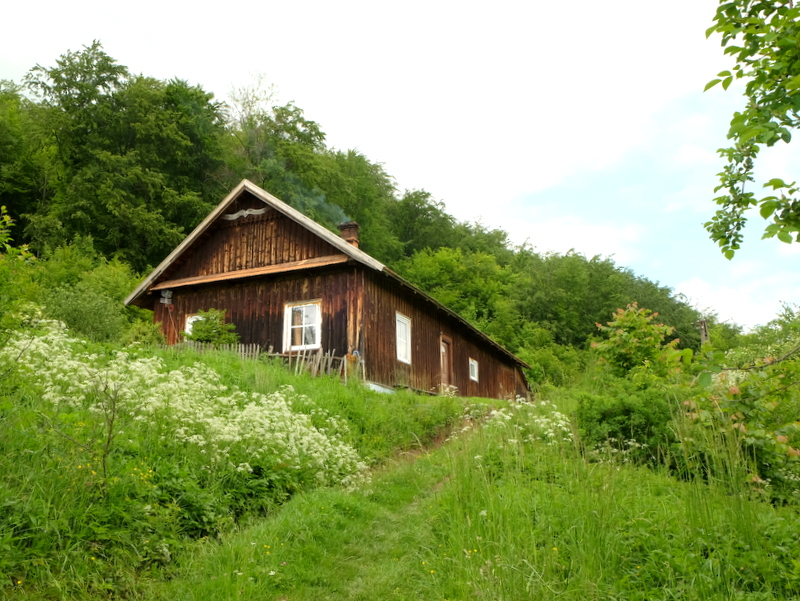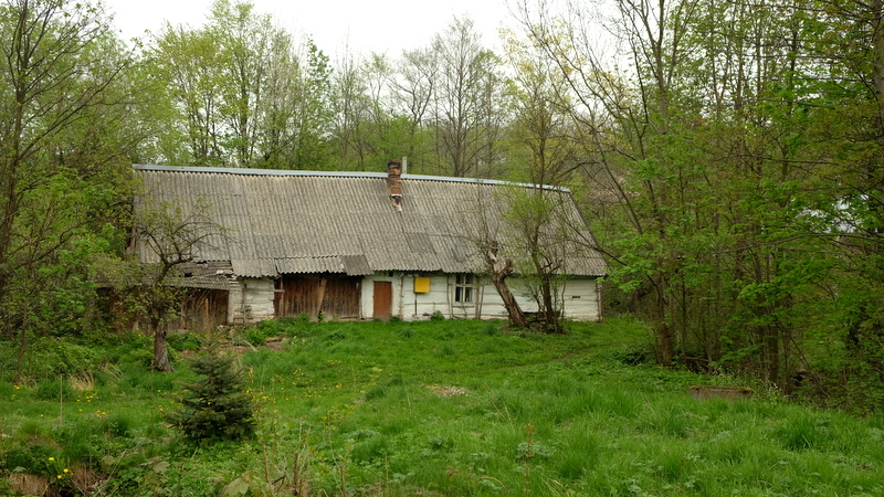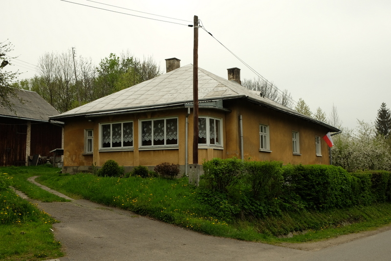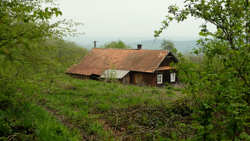 Po zwiedzeniu całego cmentarza nr 14 wracamy do miejsca, gdzie przekraczaliśmy strumień i tam wchodzimy w jedną z leśnych dróg. Prowadzi ona w kierunku ogólnym zachodnim wznosząc się coraz stromiej. Po przejściu około siedmiuset metrów wychodzimy na skraj niewielkiej polany, gdzie stoi stary, drewniany dom.