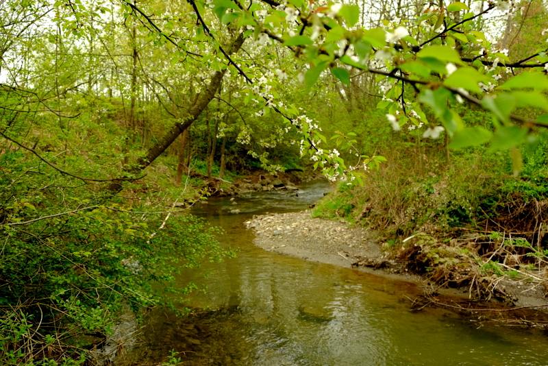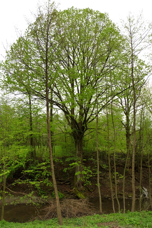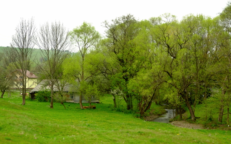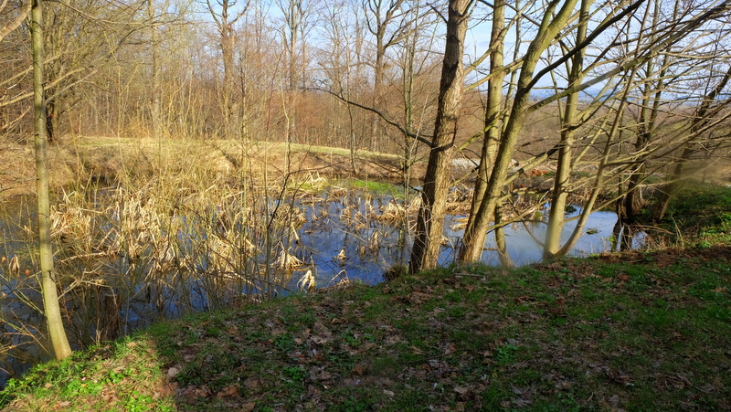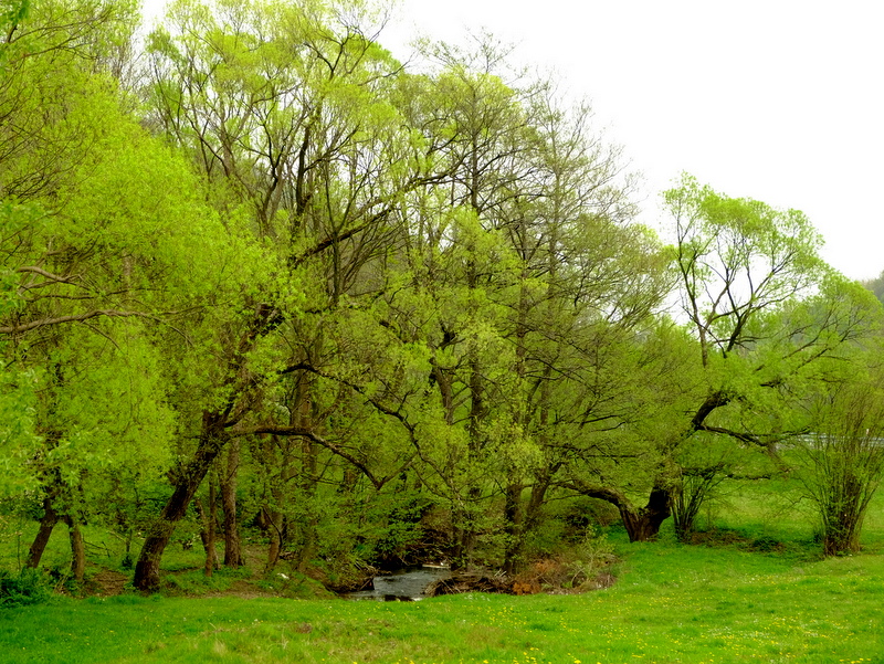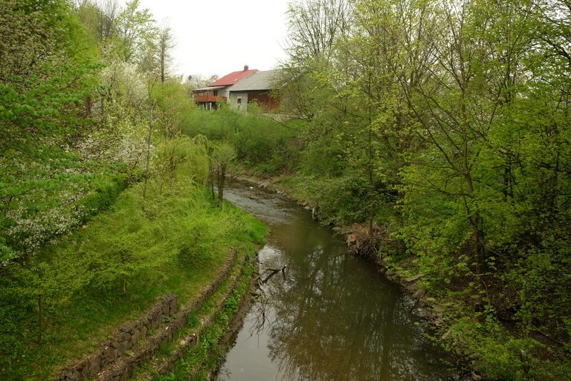 Dalej, po lewej stronie drogi rzeczka wije się malowniczymi meandrami. Jej brzegi porasta olszyna łęgowa, wśród której stoi opuszczone stare domostwo. Bardzo tu ładnie i spokojnie – tak sielsko można by powiedzieć. Dobre miejsce do kontenplacji i wypoczynku – jeśli ktoś takie miejsca lubi.