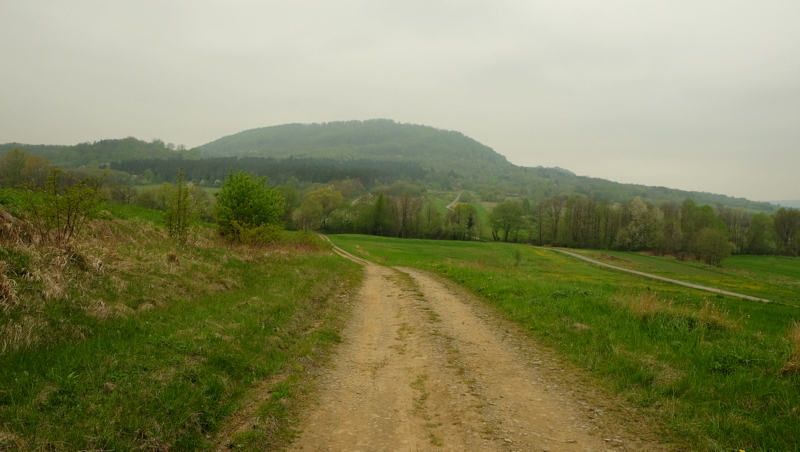 Po krótkim pobycie i posileniu się zaczęliśmy zeście ze szczytu. Zachodnia strona Cieklinki tylko w zalesionym, krótkim odcinku jest nieco stroma więc zejście z niej nie nastręcza problemów. Po odkrytym terenie idzie się już bardzo przyjemnie aż do skrzyżowania z dróżką z Bednarskiego do Bednarki, gdzie spotykamy rowerzystów.