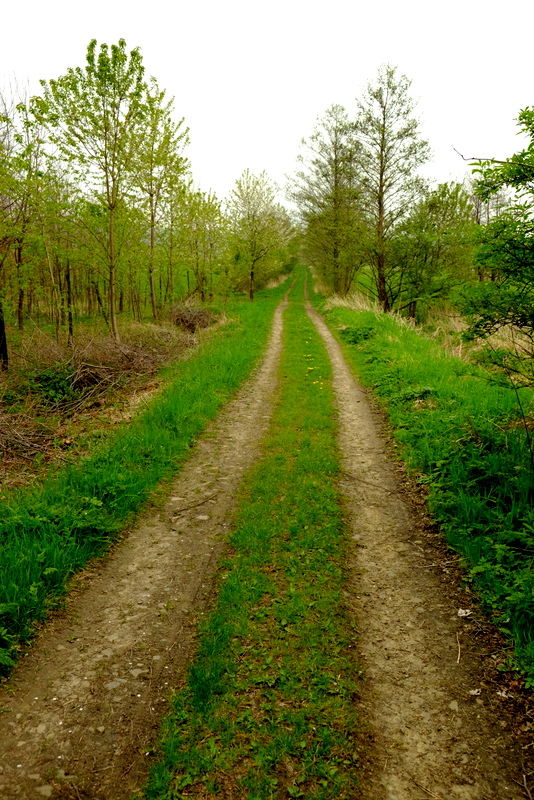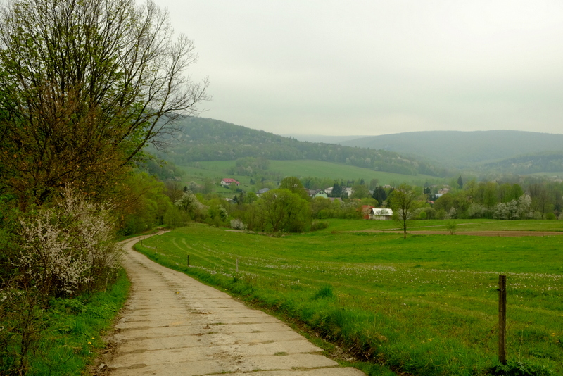Szutrowa droga wkrótce zmienia się drogę wyłożoną betonowymi płytami, które są pozostałością po działającej tu w czasach PRL-u Spółdzielni Rolniczej.