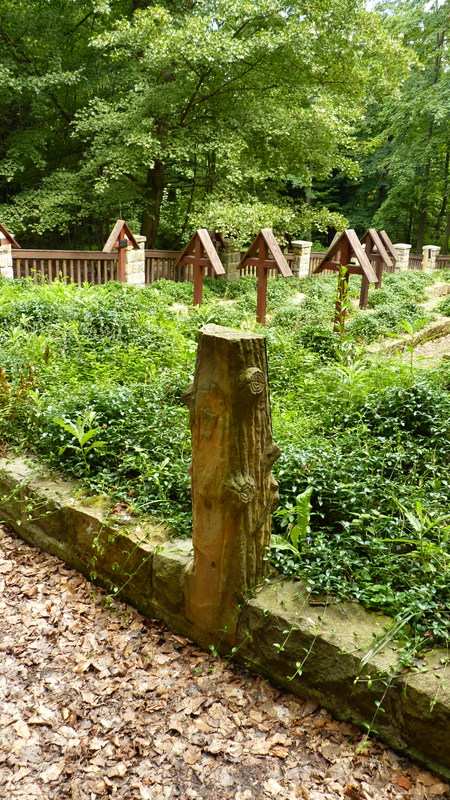 W narożnikach cmentarza oraz po obu stronach głównego krzyża stoją piękne nagrobki w formie pnia drzewa wykonane z piaskowca. Na ich ściętych skośnie szczytach umieszczone są żeliwne tablice.