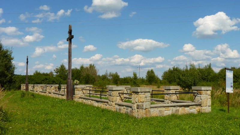 Po drugiej stronie trzeba było wspiąć się po stromej skarpie na wysoki brzeg. W taki sposób wyszliśmy tuż obok ogrodzonego siatką zaniednanego cmentarza łemkowskiego.