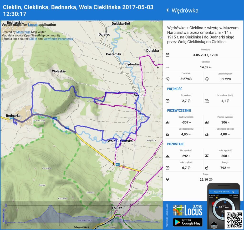 Trasa przechadzki zaczynała się w Cielkinie gdzie na dużym parkingu obok kościoła zostawiliśmy samochód. Po wizycie w cieklińskim Muzeum Narciarstwa wyruszliśmy na Cieklinkę. Wcześniej jednak odwiedzilśmy wszystkie kwatery cmentarza z I wojny światowej nr 14 – Cieklin. Następnie idąc przez las minęliśmy stary drewniany dom skąd już bardzo stromo wznoszącą się dróżka leśną weszliśmy na kulminację Cieklinki. Z Cieklinki zeszliśmy do Bednarki aby zobaczyć tamtejszą dawną cerkiew i wielowyznaniowy cmentarz po czym skierowaliśmy się na wschód. Przełomowym odcinkiem Bednarki, później drogami i bezdrożami wśród podmokłych łąk oraz nadrzecznych zarośli porastających brzegi malowniczej rzeczki Bednarki poszliśmy do Woli Cieklińskiej. Tam obejrzeliśmy cerkwisko i tamtejszy, łemkowski cmentarz, następnie poszliśmy przez wieś do Cieklina.