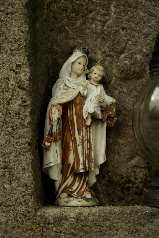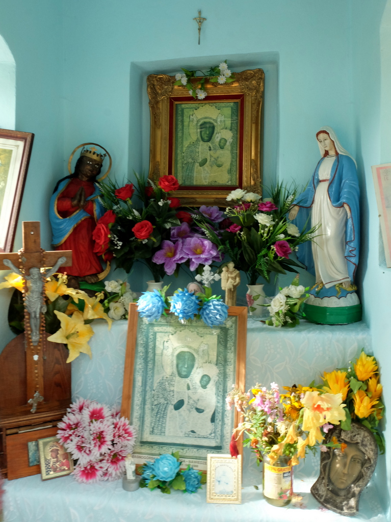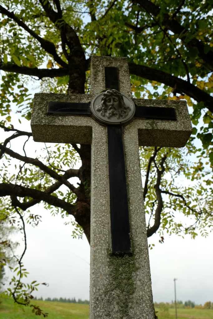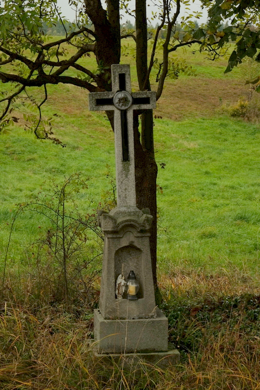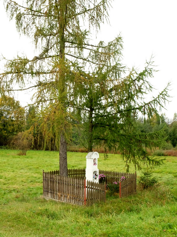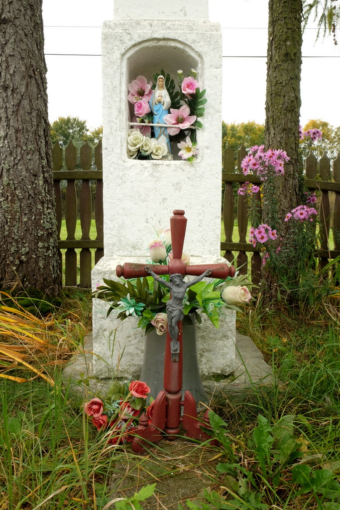 Jadąc dalej mijam też – jakże by inaczej – przydrożny krzyż pod starą lipą i dużo młodszą jarzębiną. We wnęce rzeźbionego, kamiennego cokołu tego krzyża znajduje się maleńka, wyglądająca na współczesną, figurka Matki Boskiej.