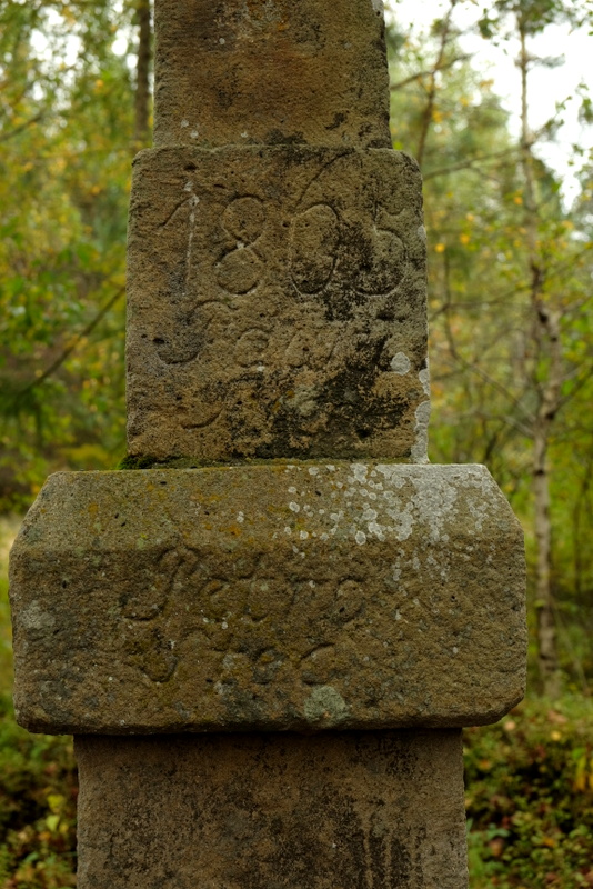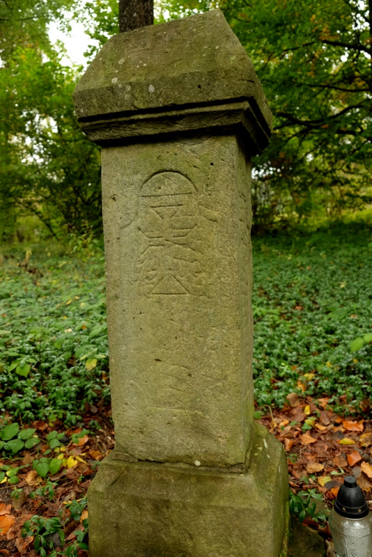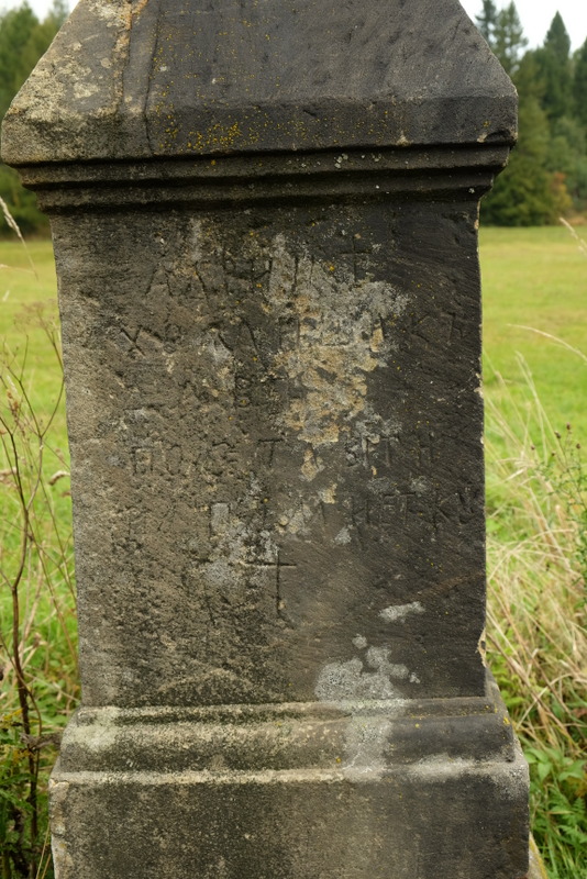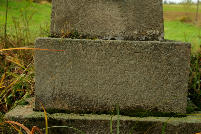 Pod cokołem, na kamiennym bloku widnieją wyryte cyrylicą – imię i nazwisko fundatora i rok 1932. Na tym kamiennym cokole ktoś dokleił współczesny, lastrykowy krzyż z głową Chrystusa. Ktoś chciał dobrze ale jednak dość nienaturalnie to teraz wygląda …