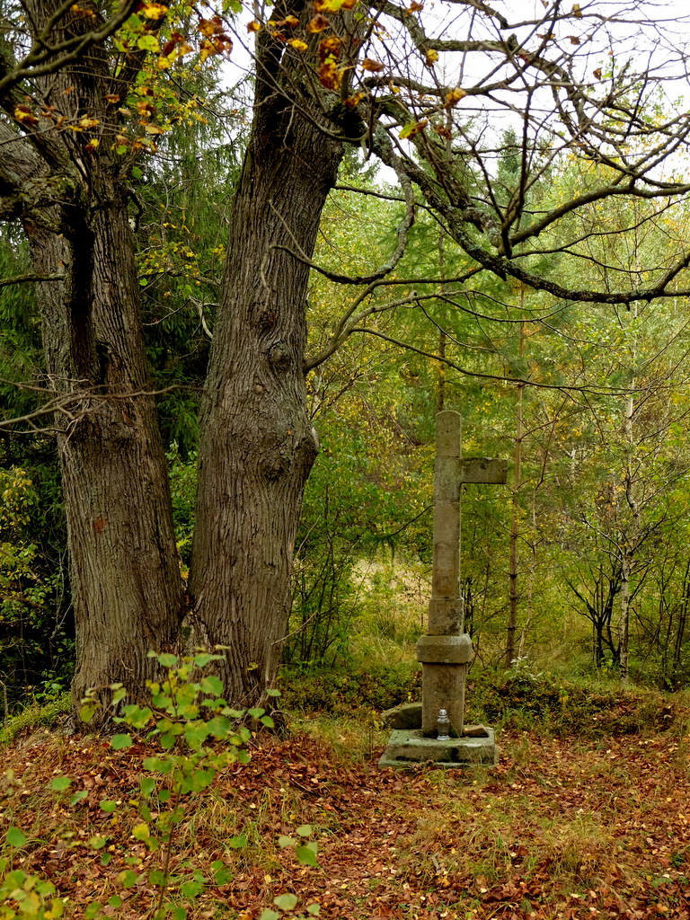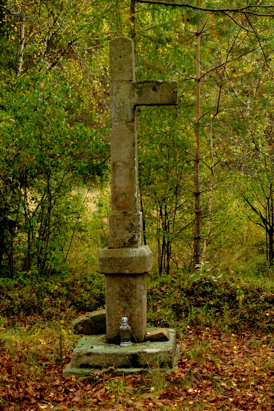 Jadąc drogą przez teren rezerwatu przejeżdżam obok stojącego przy drodze samotnego, pięknie zdobionego, żeliwnego krzyża na piaskowcowym cokole. Wyryta jest na nim data 1901. To w przybliżeniu w tej okolicy przebiegała granica między Rudawką Jaśliską a Jasielem.