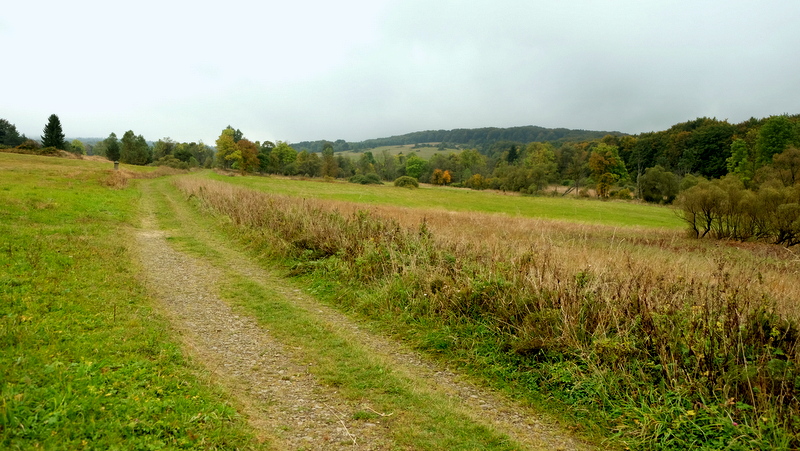 Odcinkiem drogi wyłożonej tu betonowymi – a jakże – płytami kieruję się na południowy wschód, w stronę nieistniejącej miejscowości Rudawki Jaśliskiej. Kończą się też rozleglejsze tereny bo las ekspansywnie wkracza w opuszczone przez ludzi tereny.