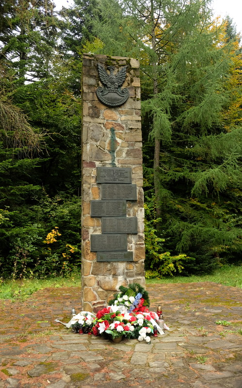 Po zakończeniu wojny, tereny te były areną walk WP z banderowcami z UPA. W marcu 1946 roku przeprowadzano ewakuację 30 osobowej obsady strażnicy WOP przez oddział żołnierzy wspomagany funkcjonariuszami MO z zagrożonej przez UPA strażnicy w Jasielu. 20 marca zostali oni zaatakowani i rozbici przez połączone siły trzech sotni (Chrina, Bira i Myrona). Dwóch żołnierzy zginęło, kilku odniosło rany a resztę schwytano i wzięto do niewoli. Oficerów i milicjantów rozstrzelano, pozostałych zaś podzielono na grupy wcześniej ich weryfikując. Część z nich bestialsko zamordowano a pozostałych po torturach i obdarciu z mundurów ponoć wypuszczono. Do dziś nie wiadomo co stało się z około dwudziestoma osobami. Więcej o tym tragicznym zdarzeniu, które upamiętnia pomnik można przeczytać tutaj. Dodam jeszcze, że w głębi lasu za pomnikiem znajduje się metalowy krzyż a pod nim miejsce przypominające zbiorową mogiłę. Być może pochowano tu część z pomordowanych żołnierzy WOP-u, lub też tych zaginionych???