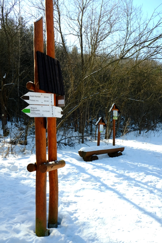 Od tej polanki już prawie płasko biegnę mijając kolejne mostki nad Potasówką i docieram do szlabanu. Tutaj ma swój początek ścieżka przyrodnicza “Folusz”, która prowadzi do Wodospadu Magurskiego i mijając kolejne przystanki doprowadza do Diablego Kamienia.