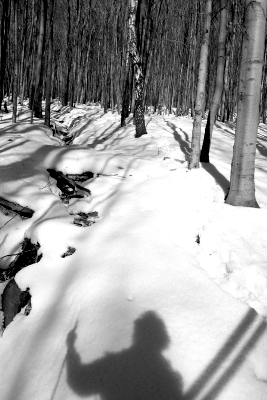 Ta z kolei przeistacza się w ścieżkę leśną. Wzdłuż tej ścieżki spływa z gór wąskim jarem strumień. Podejście staje się strome i bardzo niewygodne do podchodzenia na nartach. Jest tu wąsko, ścieżka biegnie kamienistym jarem tego strumienia więc decyduje się odpiąć narty. Zatrzymuję się i przypinam narty do plecaka – odtąd niezbyt długi odcinek tego podejścia pokonuję „z buta”.