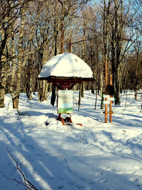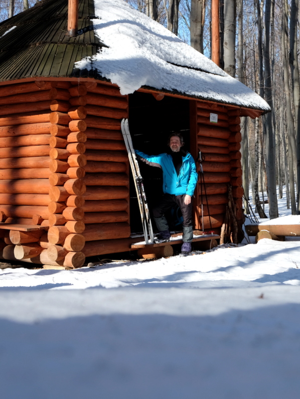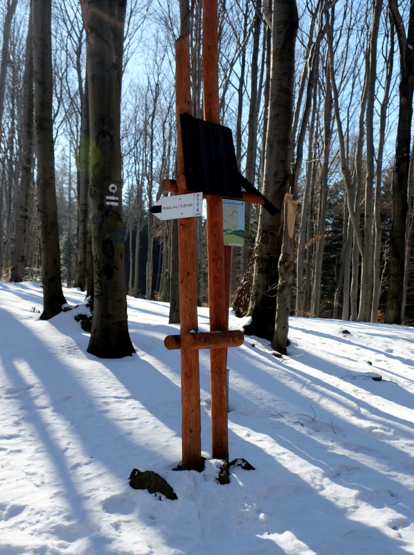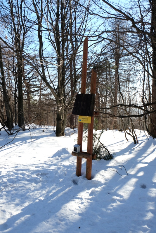Sam poruszam się na nartach więc łatwo jest mi omijać te powalone drzewa. Wkrótce poprzez pnie drzew zauważam w oddali drewniany, niewielki budynek. Jest to charakterystyczny dla Magurskiego Parku Narodowego solidny deszczochron a obok niego stoi węzeł szlaków.