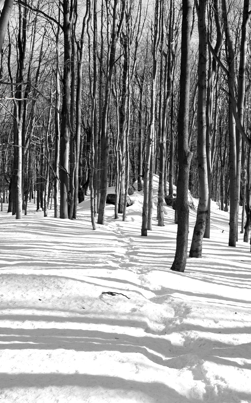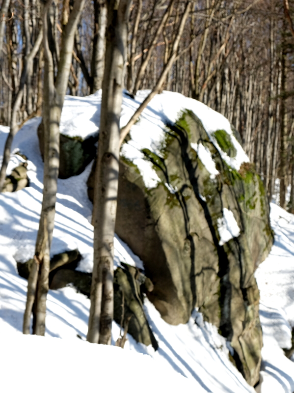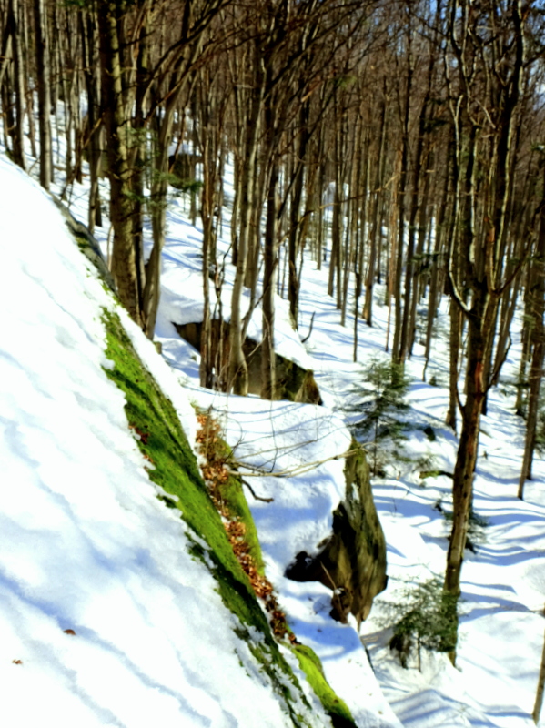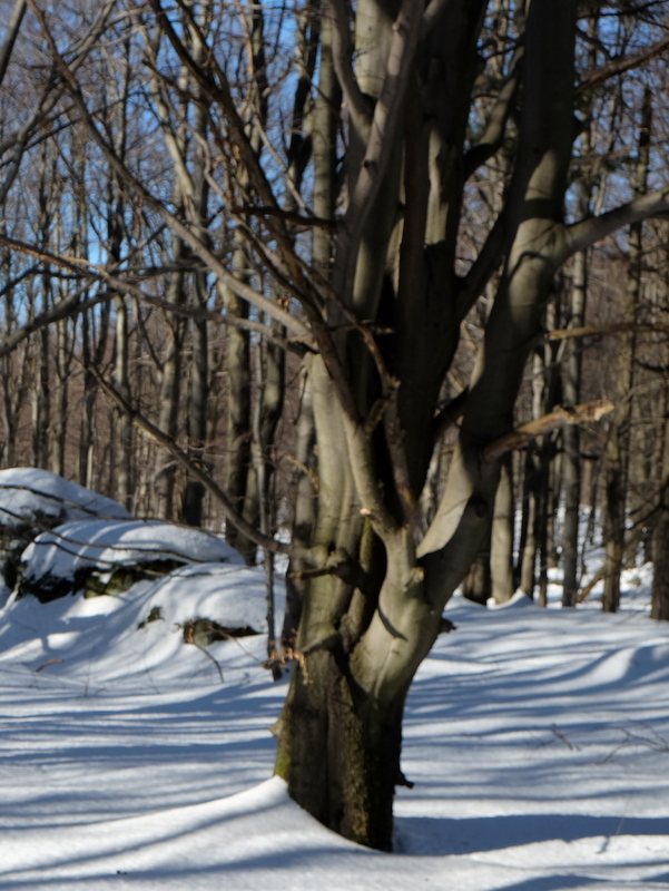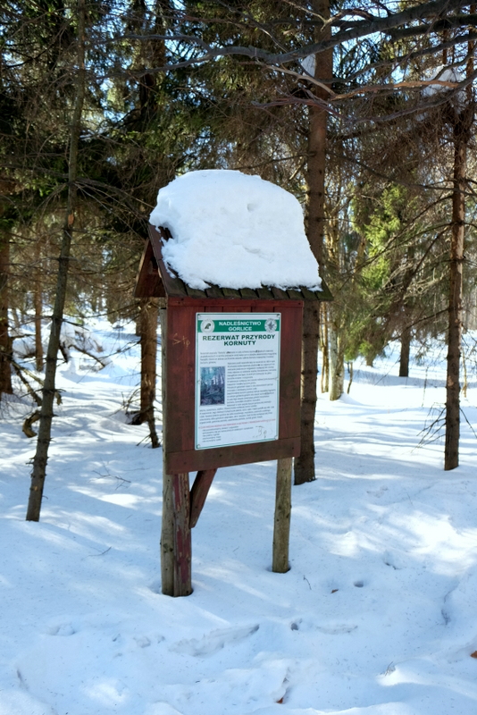 Biegnę na nartach jakiś czas grzbietem aby po chwili, po prawej stronie, w głębi lasu dostrzec pierwsze wystające spod śniegu skały. To już w tych okolicach zaczyna się teren rezerwatu przyrody nieożywionej „Kornuty”. Zjeżdżam z grzbietowej dróżki i podbiegam do pierwszych skałek, następnie dalej w głębi lasu odszukuję kolejne, większe już ostańce skalne.