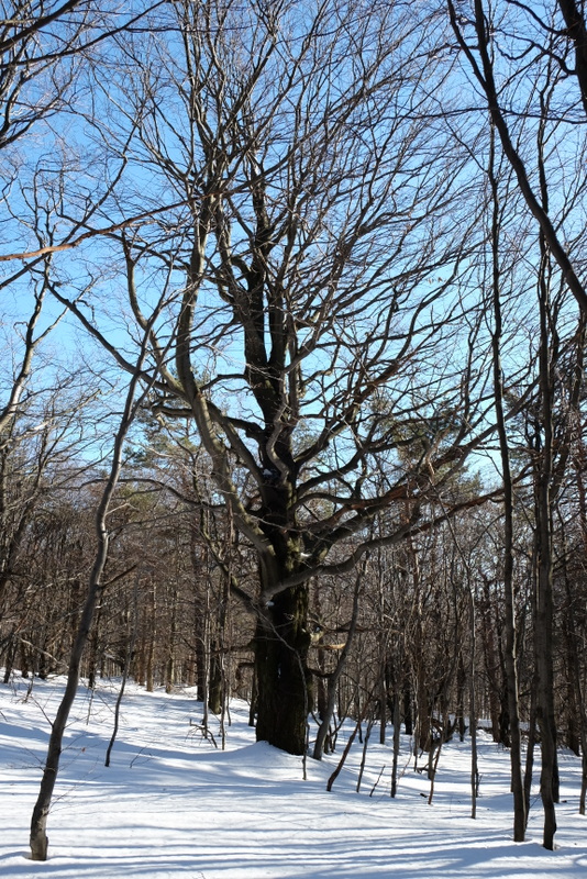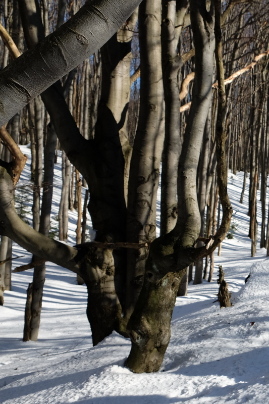 Zatrzymuję się tutaj tylko po to aby udokumentować miejsce na zdjęciach i biegnę dalej, przypominając sobie, że dawniej, w latach 70-tych ubiegłego wieku zbierałem tu borówki. Tak – znajdowała się tu jeszcze wtedy rozległa polana grzbietowa, którą porastały krzewinki tych leśnych owoców. Z czasem polanę pochłonął las bukowy i tak jest do dziś.