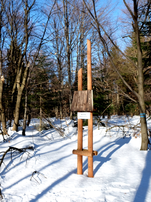 Po obejrzeniu tych ciekawie ukształtowanych skał wracam do głównego grzbietu, mijam tablice z nazwą rezerwatu i po krótkim biegu docieram do kulminacji Kornutów (830 m n.p.m.).