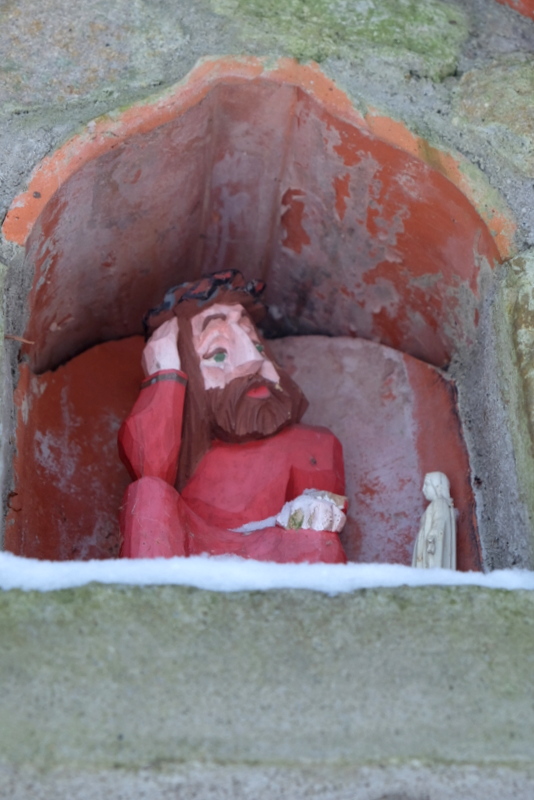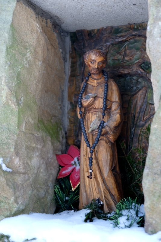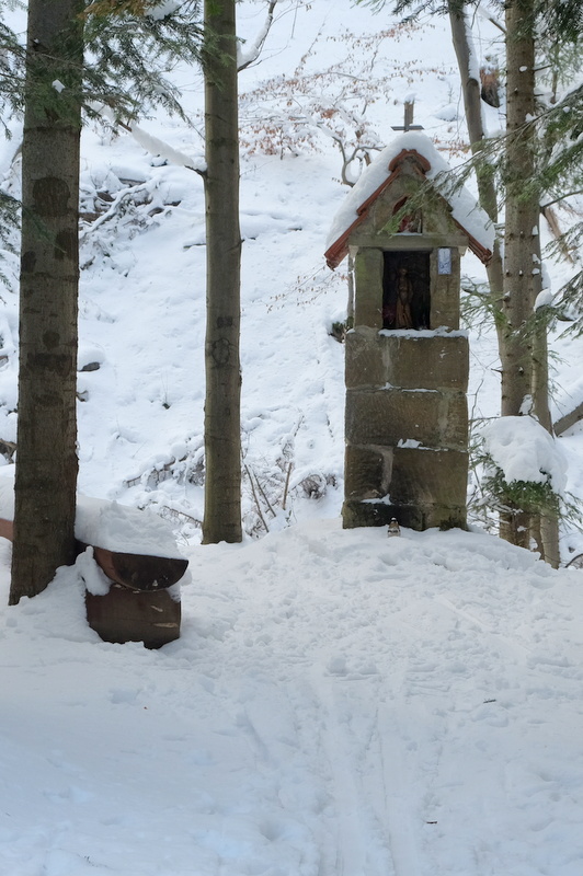 Wcześniej jednak nim dobiegnę do mostu, po lewej stronie drogi, na końcu niewielkiej polanki, nad brzegiem potoku znajduje się niepozorna kapliczka murowana z pustaków. W jej wnęce nakrytej dwuspadowym daszkiem znajduje się piękna rzeźba św. Franciszka. Nad nią w maleńkiej wnęce równie maleńka figurka Jezusa Frasobliwego.