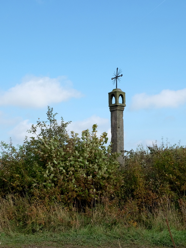 Po dokładnym rozejrzeniu się w okolicy okazuje się, że dawna droga, która biegła w niewielkim wgłębieniu jest obecnie mocno zarośnięta i przez to niewidoczna. Cokół krzyża stoi po jej południowej stronie. Zwykle front krzyża skierowany jest do drogi a tutaj napis na cokole wskazuje co innego. Cokół nie jest dobrze osadzony bo lekko się porusza na boki. Wygląda więc na to, że stoi do dawnej drogi tyłem. Być może ktoś kiedyś go powalił a jakiś czas później, gdy droga była już zarośnięta i niewidoczna, ktoś inny ustawił go w ten sposób? Frontem do nowej, polnej dróżki? Trudno dzisiaj to stwierdzić.