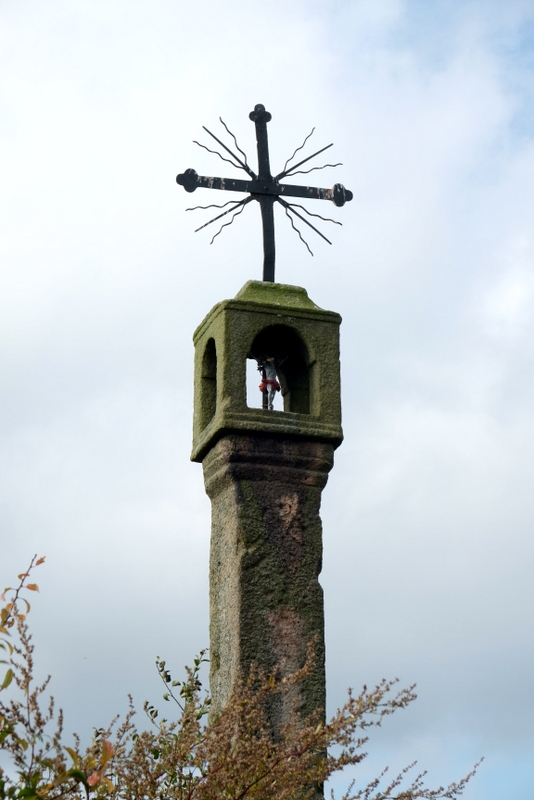 Po zlustrowaniu terenu okazuje się, że piaskowcowy cokół zniszczonego krzyża jest pochylony i niezbyt mocno osadzony w gruncie. Sam krzyż – pewno też kamienny (chociaż pewności co do tego nie mam) musiał zostać dawno temu utrącony. Jego śladów w okolicy nie znajdujemy – pewno ich już nie ma. Jeśli zaś był żeliwny to być może ktoś go zabrał?
