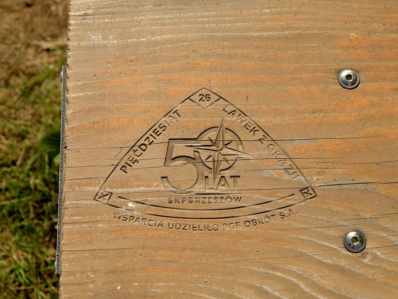 Na szczycie zasiadamy na ławeczce na krótki odpoczynek, posilenie się i uzupełnienie płynów. Ławeczka ta jest 26 z serii 50 ławek wykonanych dla uczczenia 50-lecia istnienia SKPB Rzeszów. Kilka z takich ławek zaliczyłem już podczas swoich wędrówek.