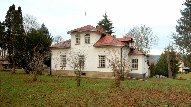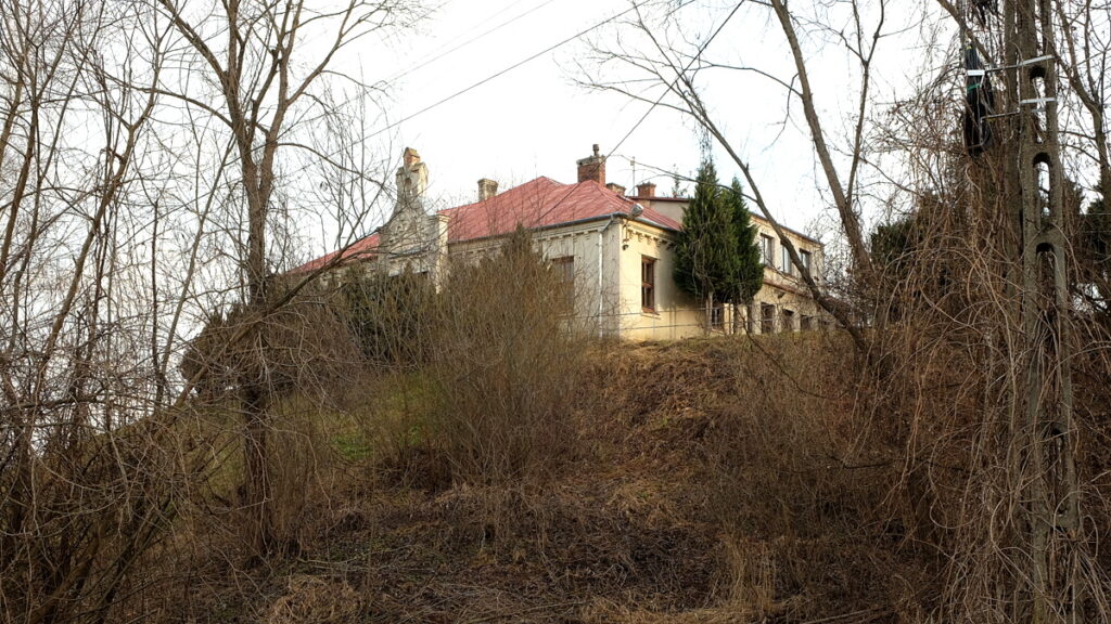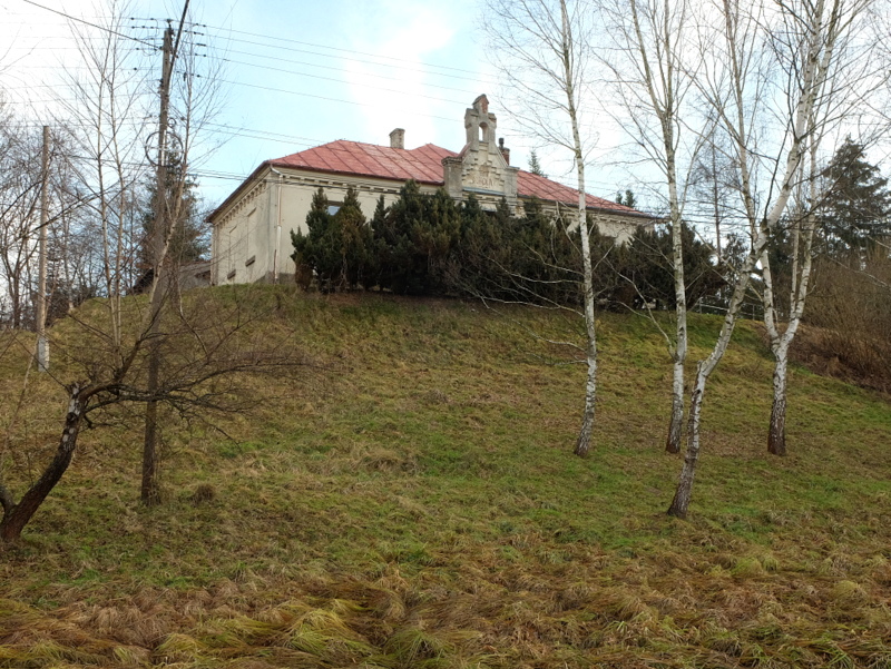 Tutaj, skręcając w drogę odchodzącą w prawo i mijając stare drewniane budynki mieszkalne, pamiętające jeszcze czasy przedwojenne, można wspiąć się na wysokie strome wzgórze.