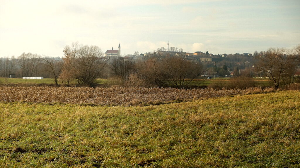 Tutaj też opuszczamy drogę do Łęk Strzyżowskich i skręcamy ostro w gruntową drogę prowadzącą na zachód.