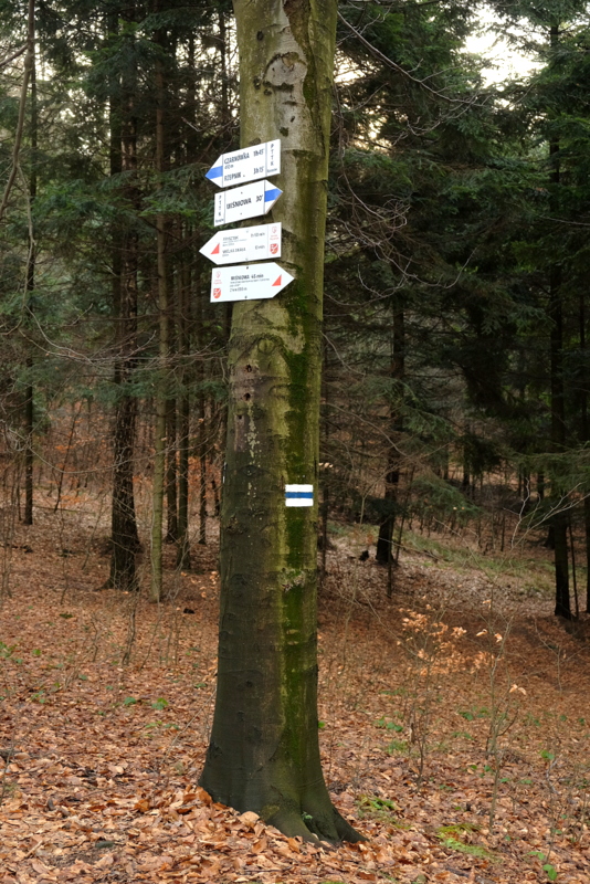 Stąd już tylko kilometr pozostał do nam długodystansowego szlaku niebieskiego PTTK: Pustków – Dębica – Wiśniowa – zamek Kamieniec nad Odrzykoniem. Odcinkiem tego szlaku będziemy dalej szli do rezerwatu „Herby” aby podziwiać liczne tutaj, rozrzucone po lesie oraz wyrastające z grzbietu Pasma Jazowej, ostańce i wychodnie skalne. Zbudowane są one głównie z piaskowców istebniańskich.