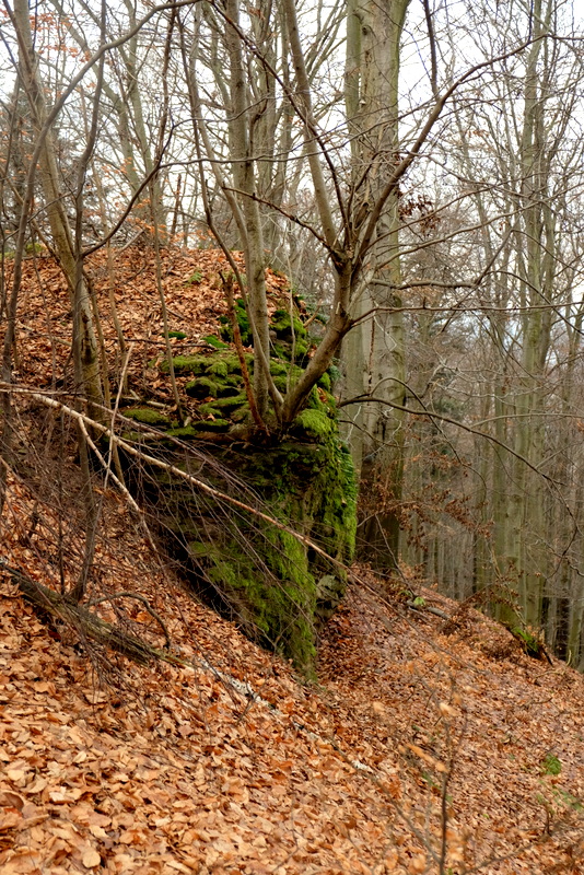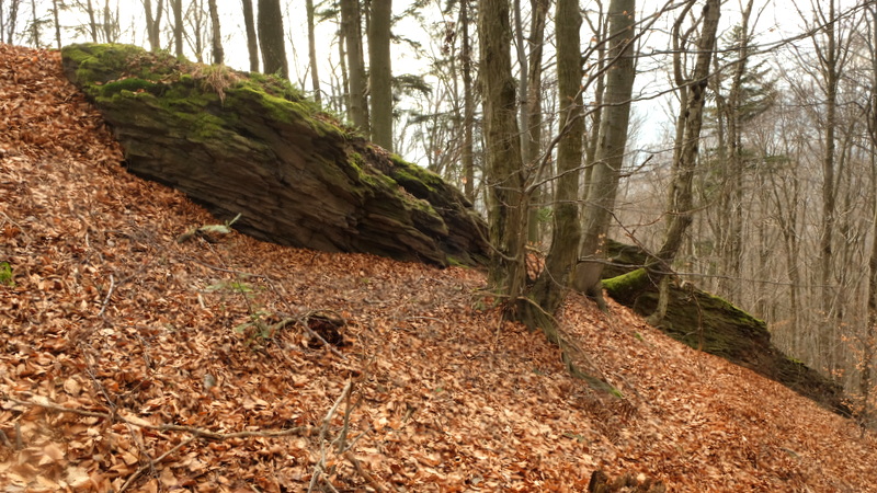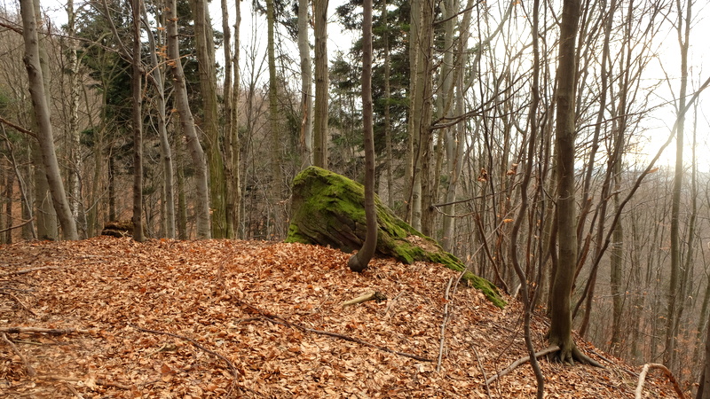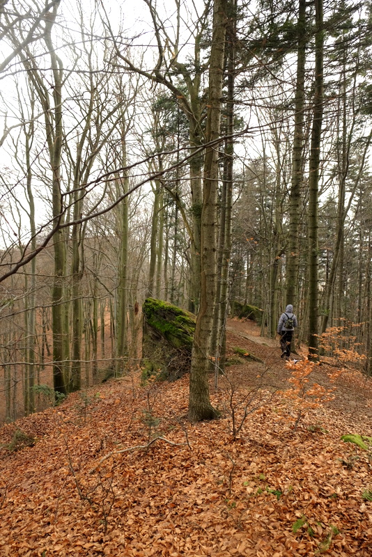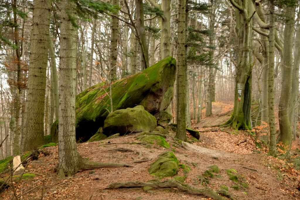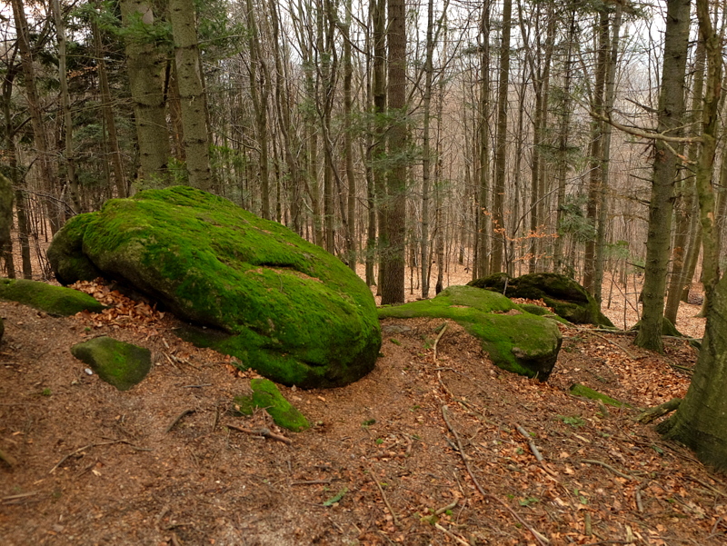 Za „Ostoją Wędrowca” znów zaczyna się strome podejście a później pierwsze skałki. Aby do nich dojść trzeba by zejść w prawo od szlaku i poszukać ich wśród drzew. Myślę, że nie warto bo nie są zbyt atrakcyjne. To płaskie, bez żadnych ciekawych form, dość duże kamienie porośnięte mchem.