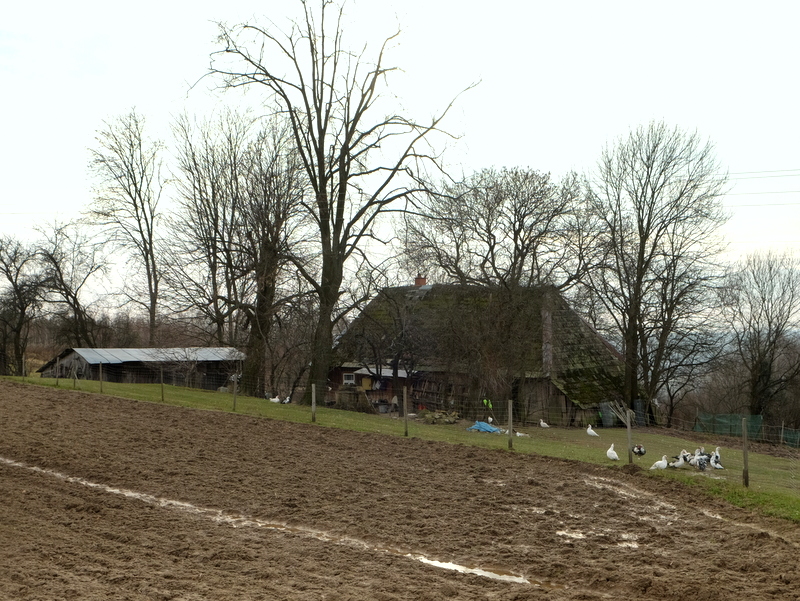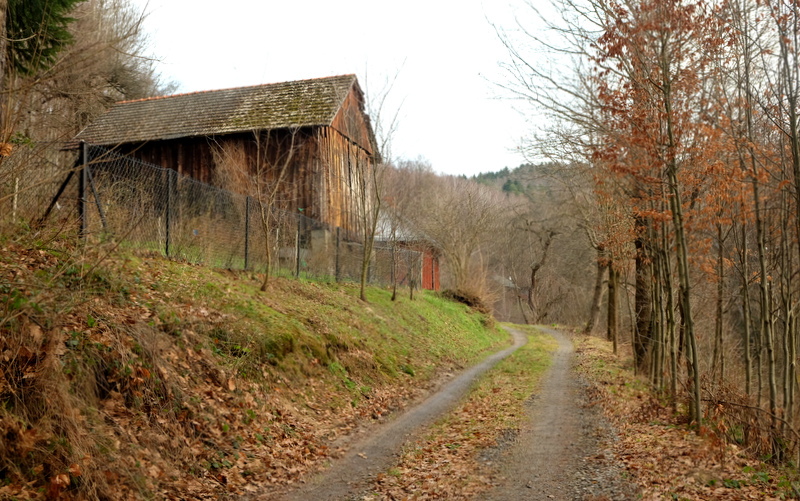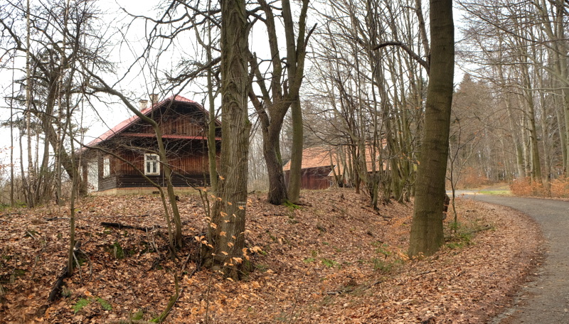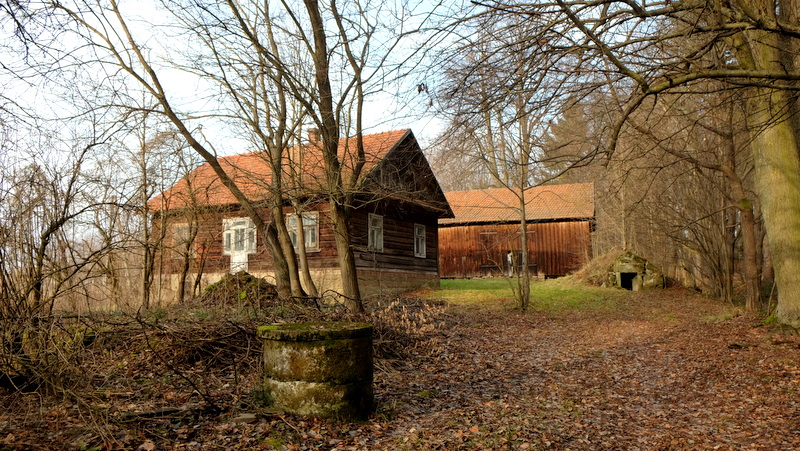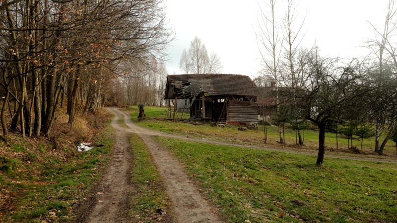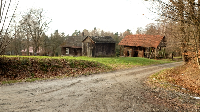 Po zejściu z grzbietu Piaskowej Góry dochodzimy do granicy rezerwatu opuszczając go po dojściu do stokówki. Stokówką – innymi słowy – drogą służącą do wywozu drewna z lasu, idziemy w kierunku południowym. Dochodzimy wkrótce do – wyglądających na opuszczone – zabudowań.