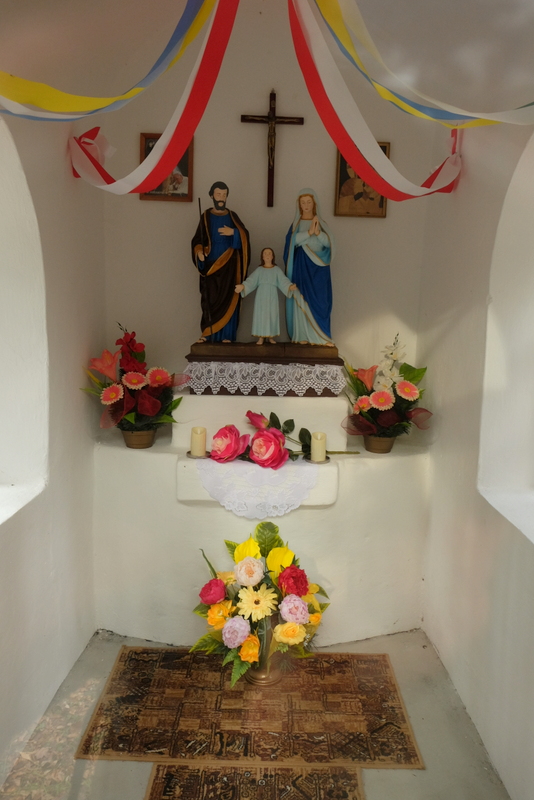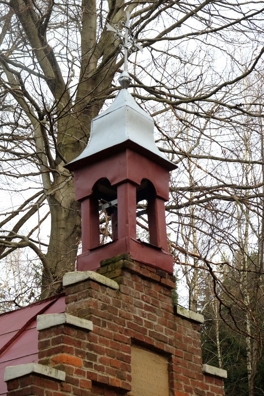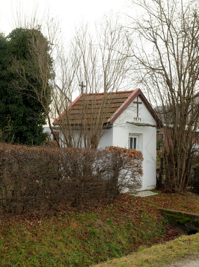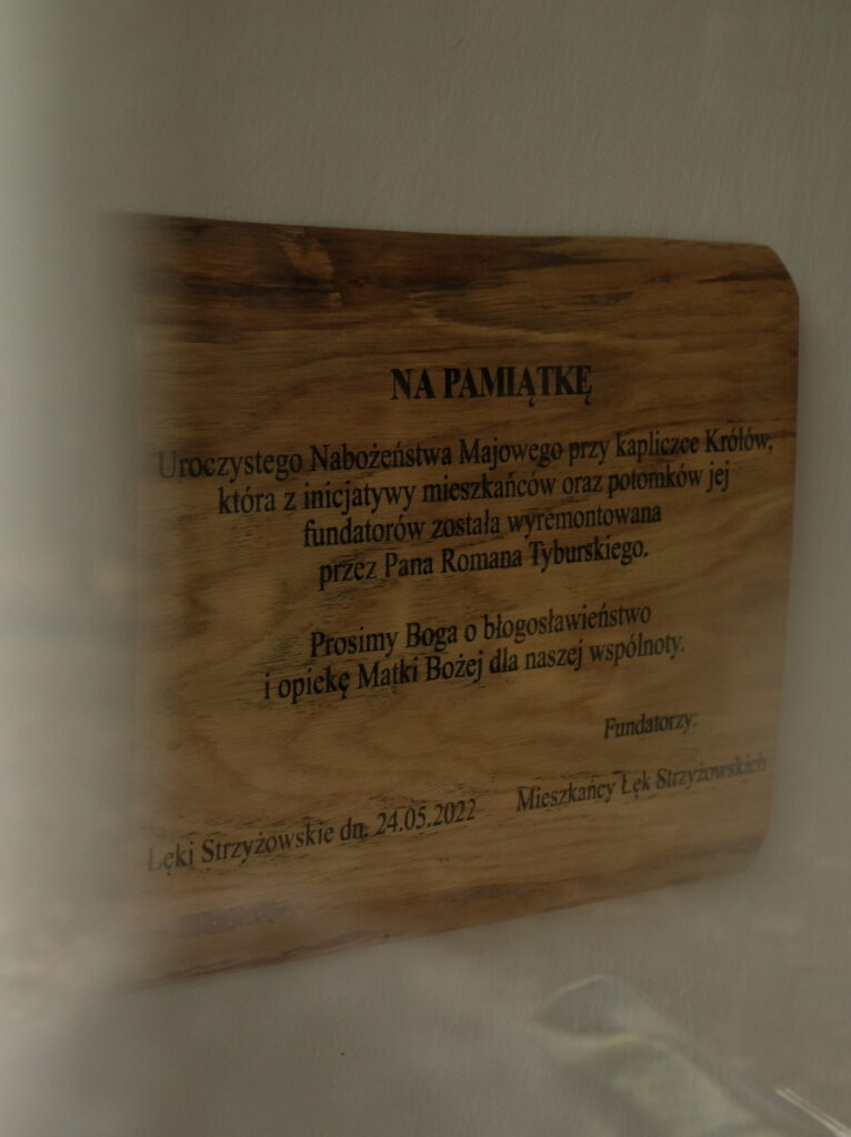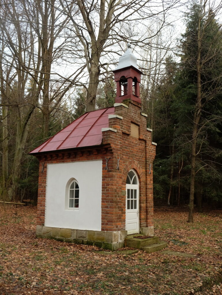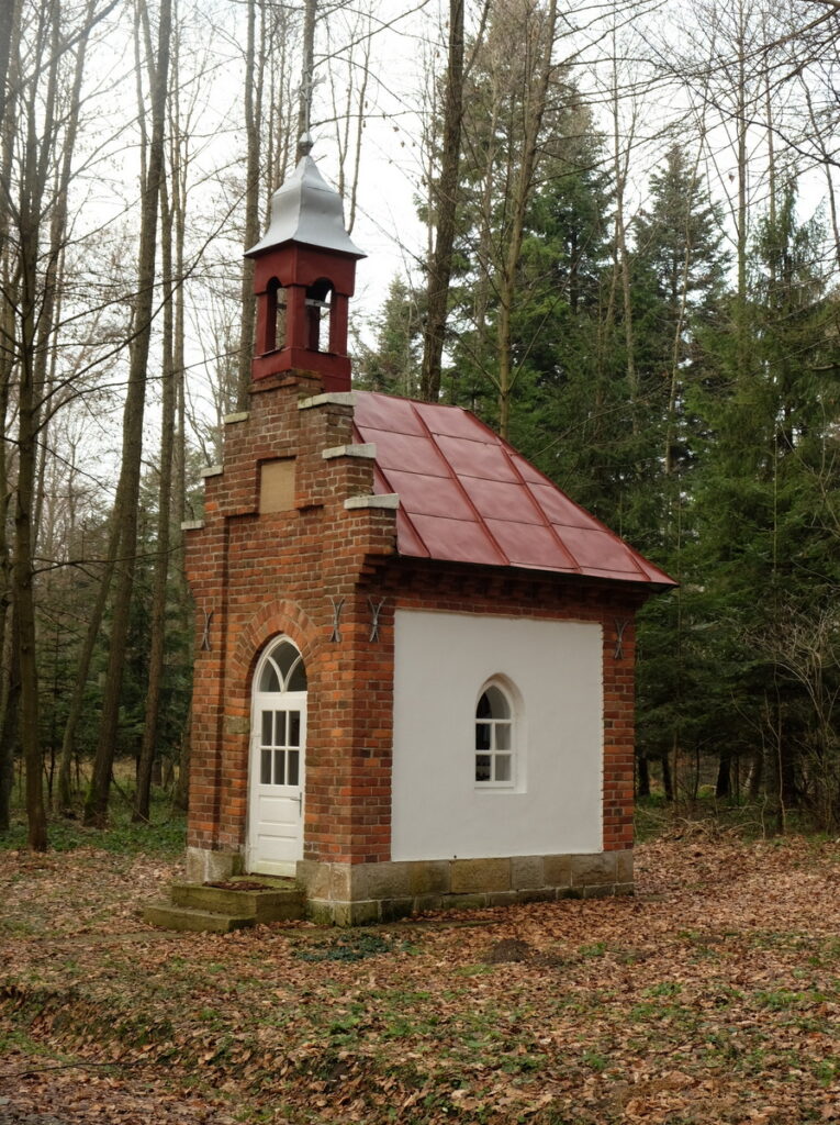 Około 300 metrów dalej – tym razem z prawej strony drogi – stoi ładna kapliczka. Wymurowana z cegły, mająca otynkowane i pobielone ściany, w których umieszczono pseudogotyckie okna nakryta jest dwuspadowym dachem pokrytym blachą. Dodatkowo – co bardzo rzadko się spotyka – zwieńczona jest miniaturową dzwonnicą. Z wygrawerowanej tablicy na ścianie kapliczki odczytujemy imiona i nazwisko fundatorów, którymi byli Piotr i Tekla Królowie w 1914 roku.