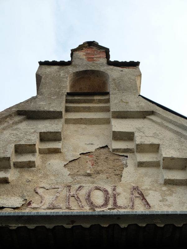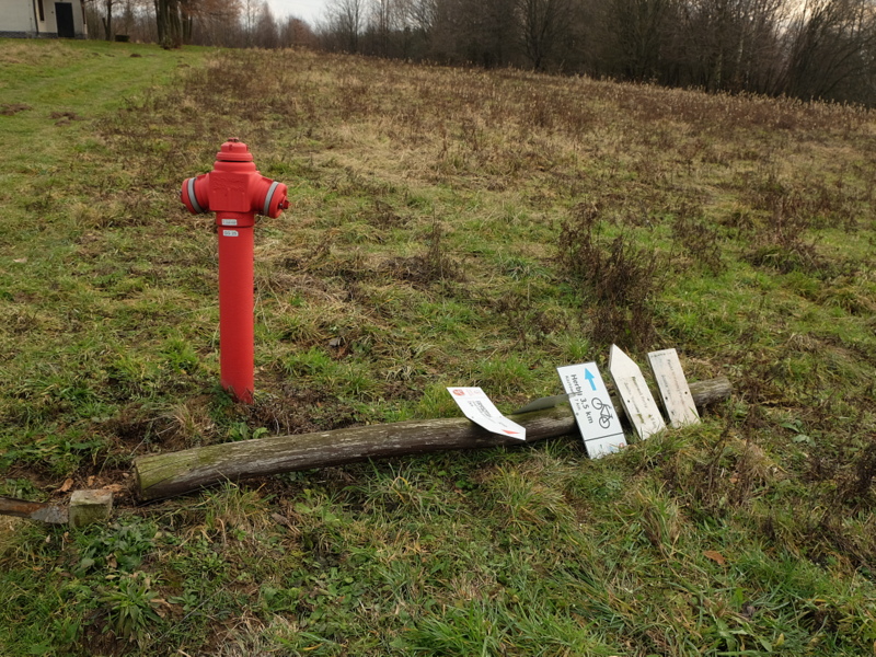 Na trawie, przy rozwidleniu wiejskich dróg leży przewrócony, bo wyrwany z betonowego cokolika, słupek z tabliczkami kierunkowymi szlaków gminnych: pieszego i rowerowego. Na rozwidleniu skręcamy w prawo i idąc przez osadę przypatrujemy się starym, drewnianym domom.