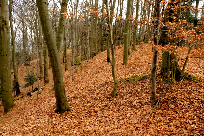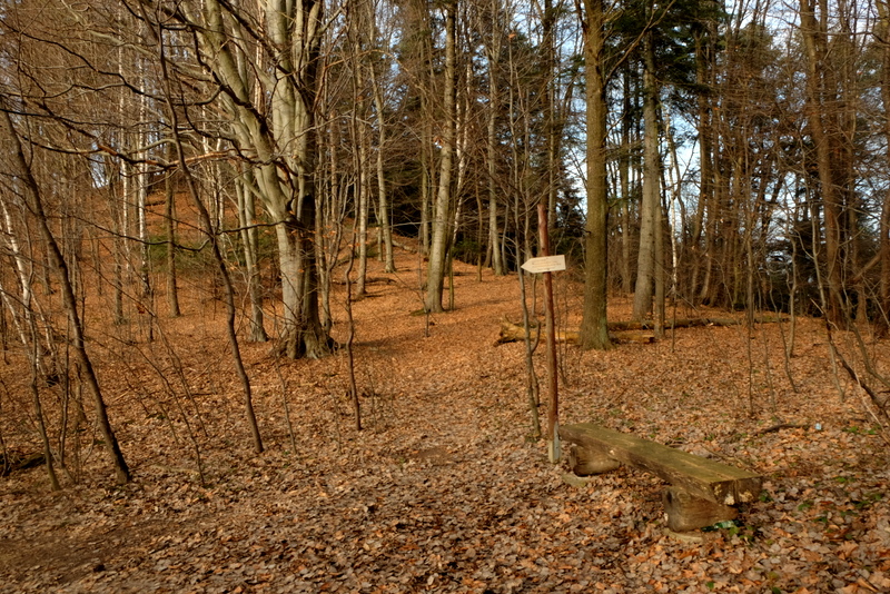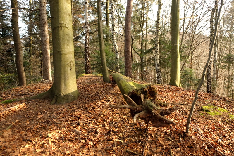 Z grodziska zalesionym grzbietem Pasma Jazowej kieruję się na wschód aby wejść jeszcze na szczyt wzniesienia Ostatek. Jest on porośnięty grądowym lasem więc widoków z niego nie ma żadnych.