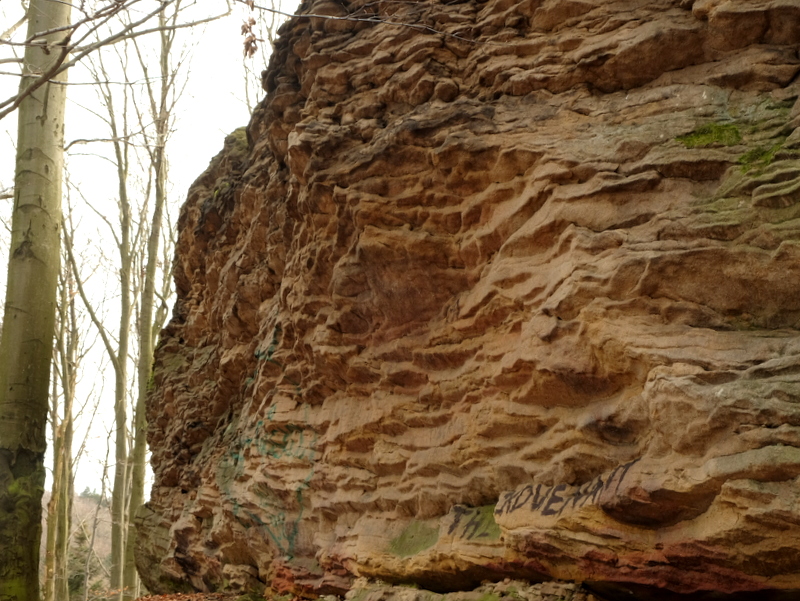 Wkrótce dochodzimy do kulminacji całego grzbietu Herbów a ta kulminacja to Piaskowa Góra o wysokości bezwzględnej 455 m n.p.m. W jej okolicy jest już całkiem sporo piaskowcowych wychodni o fantazyjnych kształtach.