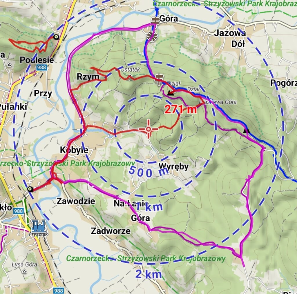 Kolorem liliowym oznaczyłem trasę przebytą razem z koleżanką i jej psem natomiast czerwonym trasę przebytą samotnie w obu częściach rezerwatu „Herby”.