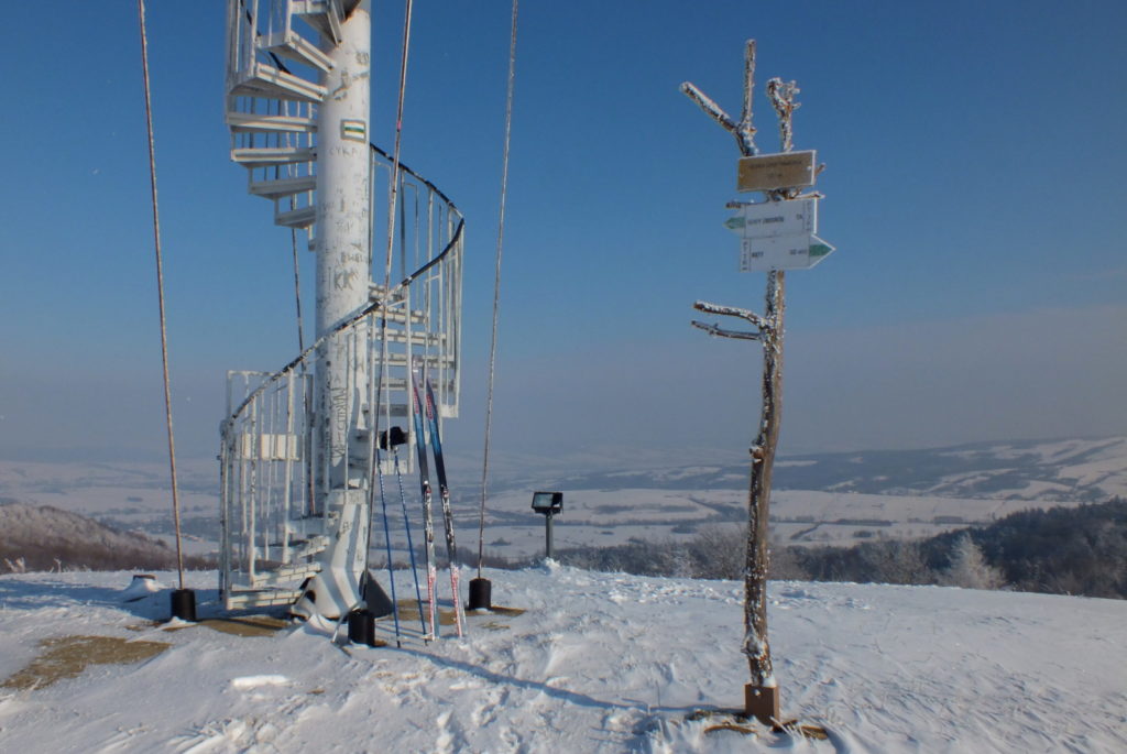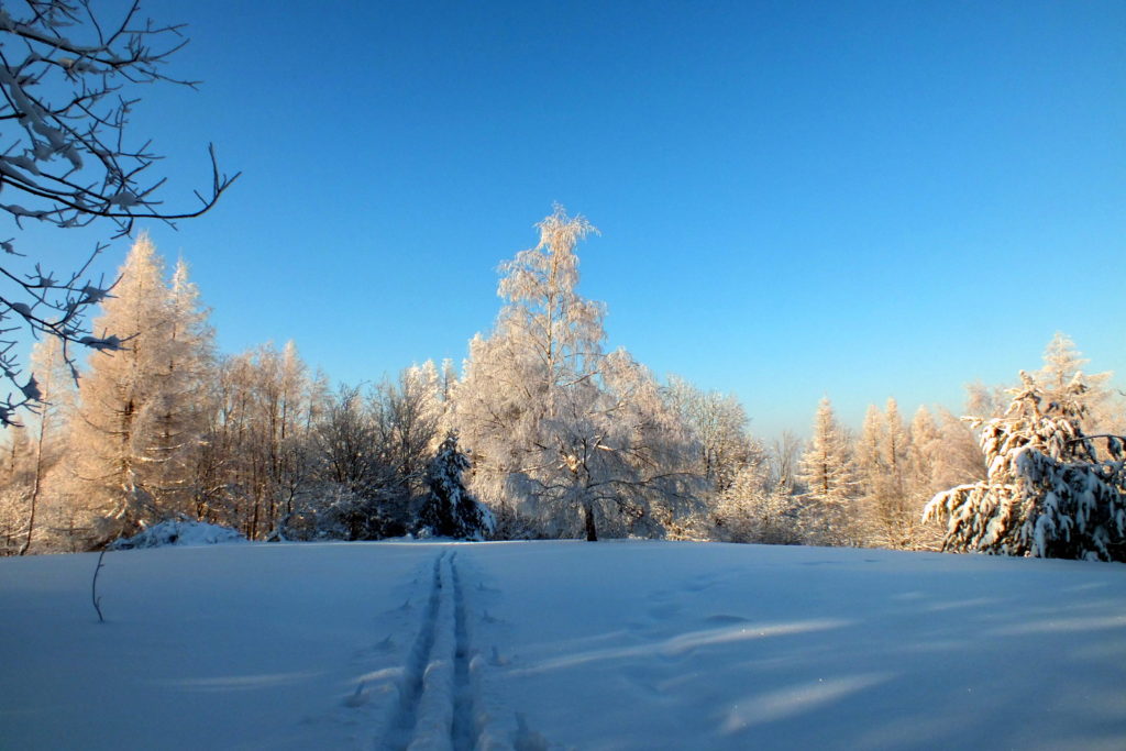 Droga wiedzie grzbietem przez piękny las. Mróz trzyma. Śniegu jest dużo tak, że czasem utrudnia poruszanie się bo wierzchnia warstwa jest zmrożona a pod nią leży lekki puch. Zapadam się więc czasem ale nie ma tragedii. Na gałęziach gęsta szadź co tylko dodaje uroku. Posuwanie się na nartach jest w związku z tym dość wolne ale przyjemne. Czasem natrafi się na jakieś połamane konary leżące na szlaku więc trzeba je ominąć. Jest tu stosunkowo płasko bez żadnych stromych podejść czy ostrych zjazdów. Taki teren bardzo lubię bo świetnie nadaje się na śladówki i nie powoduje zbytniego zmęczenia. Ale żeby nie było za dobrze to przy pokonywaniu terenowej przeszkody łamię kijek narciarski. Teraz więc poruszanie się naprzód trochę się spowolniło. Cóż – zdarza się i tak … Docieram do wierzchołka Łysej Góry a kilkanaście metrów dalej wyjeżdżam na otwartą polanę.