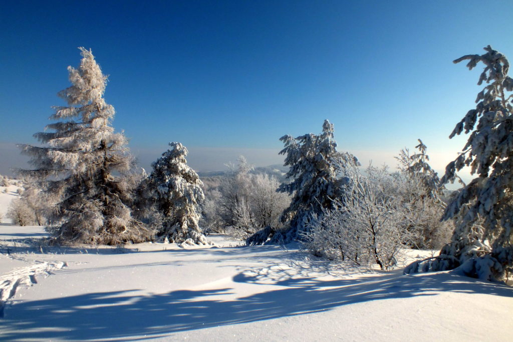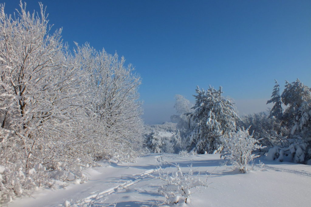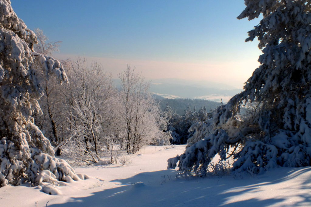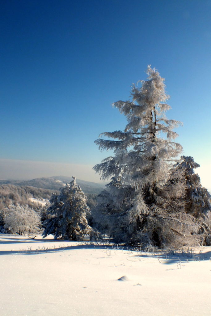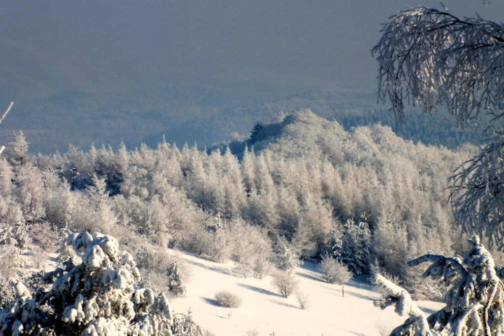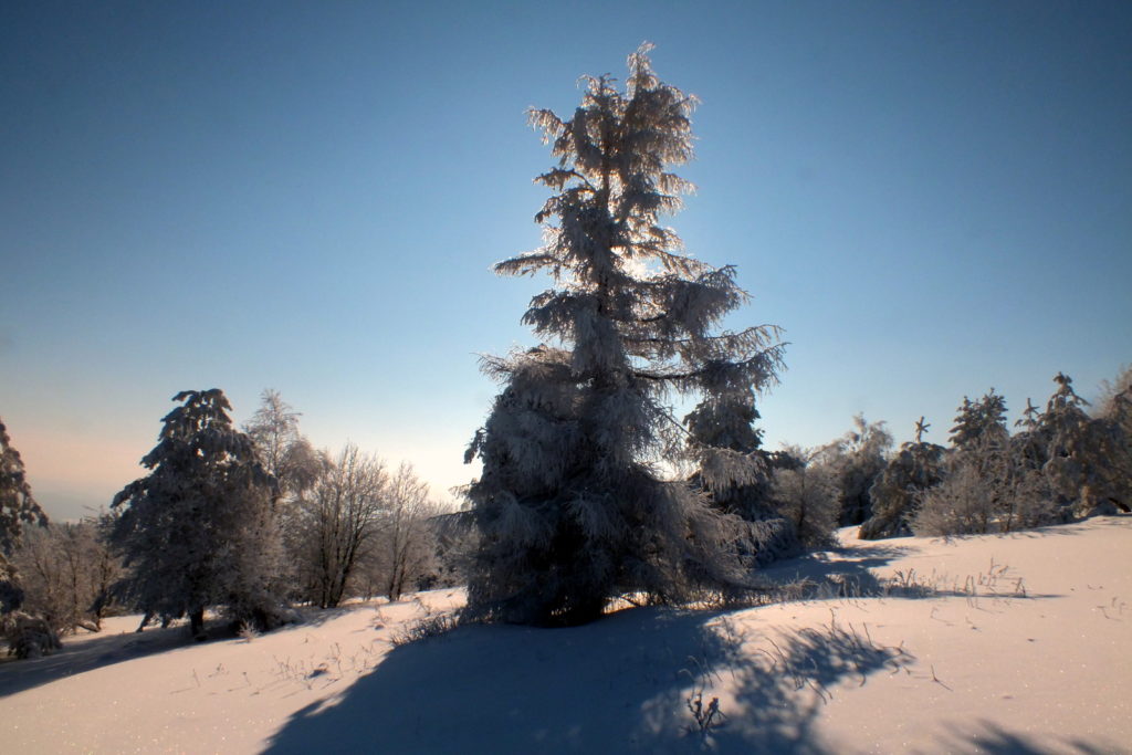Dotarłem tutaj i zaniemówiłem z wrażenia – tak pięknych, zimowych plenerów dawno nie widziałem. Zaśnieżony i zmrożony śnieg na gałęziach drzew, tworzący fantazyjne formy, piękne światło, błękitne niebo i dalekie widoki… Wyjąłem aparat i zacząłem robić zdjęcia …