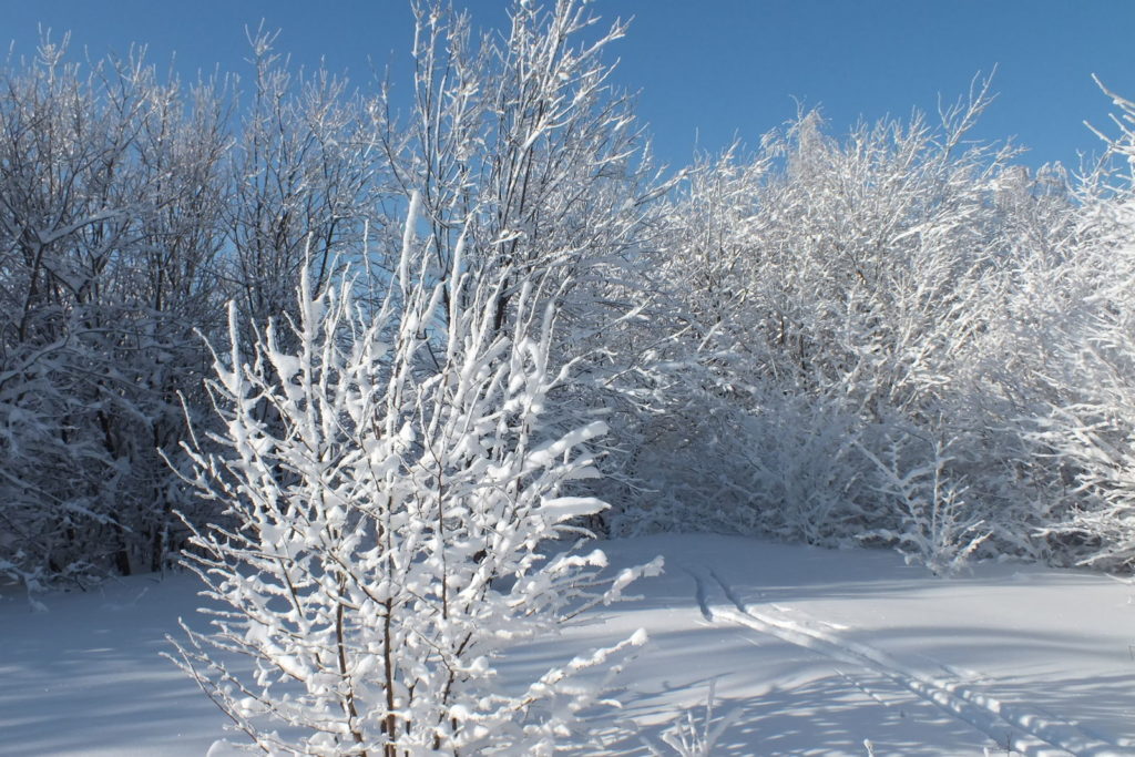 Droga wiedzie grzbietem przez piękny las. Mróz trzyma. Śniegu jest dużo tak, że czasem utrudnia poruszanie się bo wierzchnia warstwa jest zmrożona a pod nią leży lekki puch. Zapadam się więc czasem ale nie ma tragedii. Na gałęziach gęsta szadź co tylko dodaje uroku. Posuwanie się na nartach jest w związku z tym dość wolne ale przyjemne. Czasem natrafi się na jakieś połamane konary leżące na szlaku więc trzeba je ominąć. Jest tu stosunkowo płasko bez żadnych stromych podejść czy ostrych zjazdów. Taki teren bardzo lubię bo świetnie nadaje się na śladówki i nie powoduje zbytniego zmęczenia. Ale żeby nie było za dobrze to przy pokonywaniu terenowej przeszkody łamię kijek narciarski. Teraz więc poruszanie się naprzód trochę się spowolniło. Cóż – zdarza się i tak … Docieram do wierzchołka Łysej Góry a kilkanaście metrów dalej wyjeżdżam na otwartą polanę.
