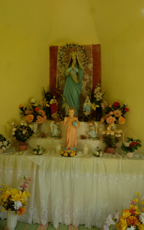 Prowadzą do niej oporęczowane, betonowe schody. Kapliczkę wybudowała śp. Magdalena Rospond, siostra dziadka Pana Henryka Rosponda, który mi o tym opowiedział. Mieszkała ona w drewnianym domu, naprzeciw kapliczki, po drugiej stronie drogi. Dom ten niestety już nie istnieje – spłonął około roku 1981. Na miejscu tamtego domu stoi dziś nowy dom, w którym mieszkają państwo pochodzący z Puław (woj. lubelskie).